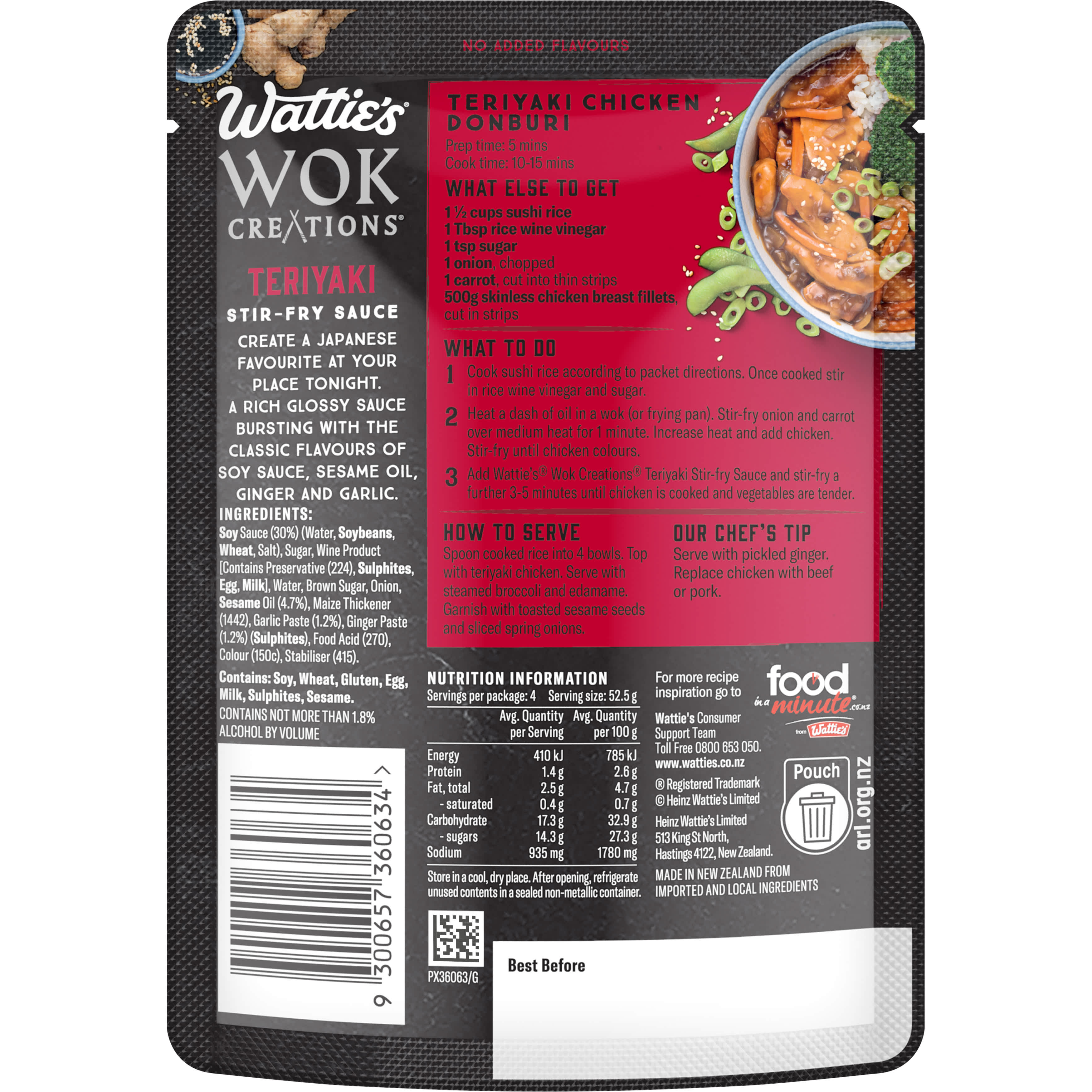 Bursting with a mixture of classic flavours of soy sauce, sesame oil, ginger and garlic, Wattie’s® Wok Creations® Teriyaki Stir-Fry Sauce is an easy way to create a Japanese favourite. Create a Japanese favourite at your place tonight with Wattie’s® Wok Creations® Teriyaki Stir-Fry Sauce. Conveniently packed in a pouch, it's great for cooking teriyaki chicken or a stir-fry for four people. Wattie’s® Wok Creations® Teriyaki Stir-Fry Sauce contains no added flavours. • No added flavours • Serves four • Perfect for teriyaki chicken donburi • Classic flavours of soy sauce, sesame oil, ginger and garlic • Convenient pouch packaging