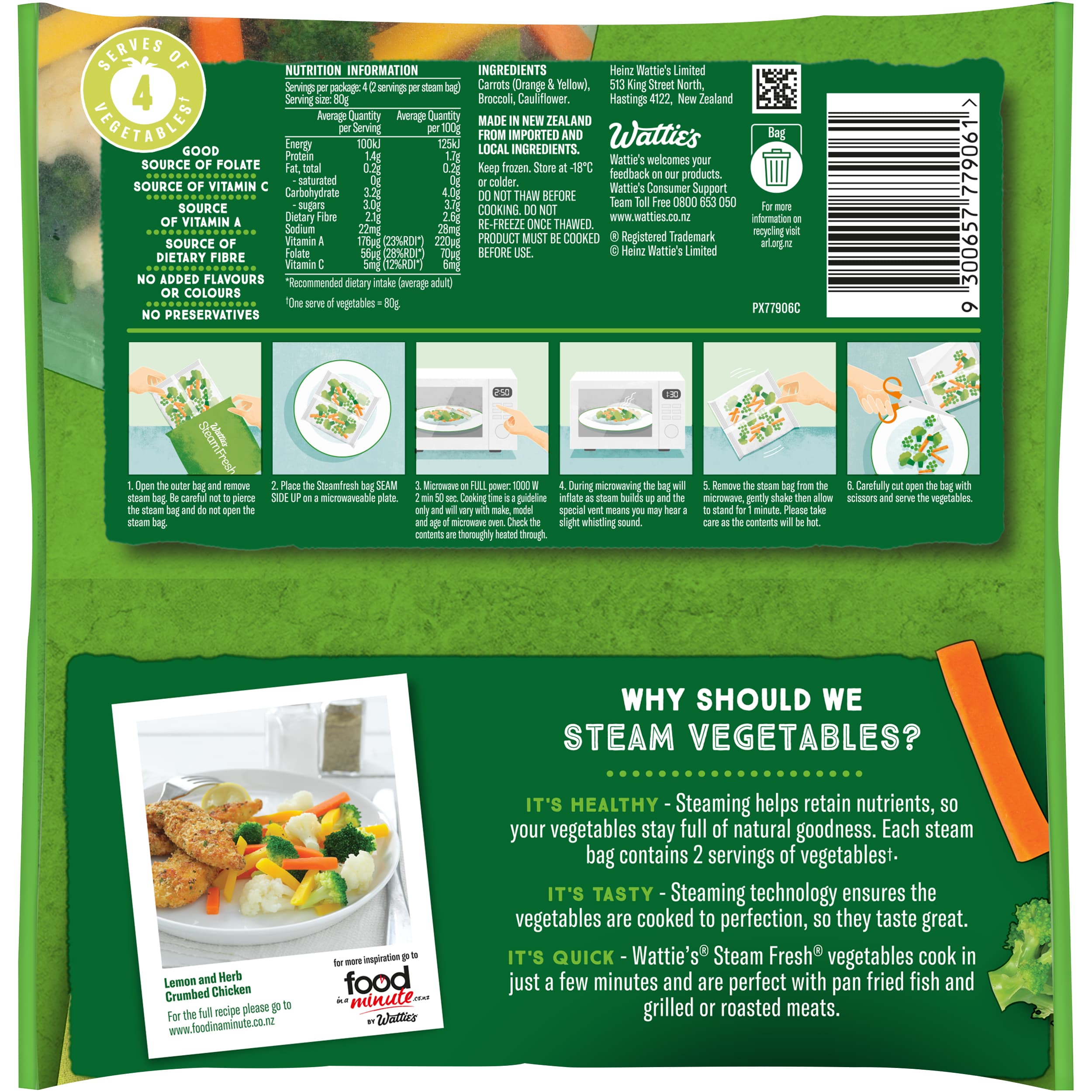 Carrots, Broccoli and cauliflower that are picked, snap frozen, then sealed in our special steam bags to lock in their goodness. Wattie's® SteamFresh®...