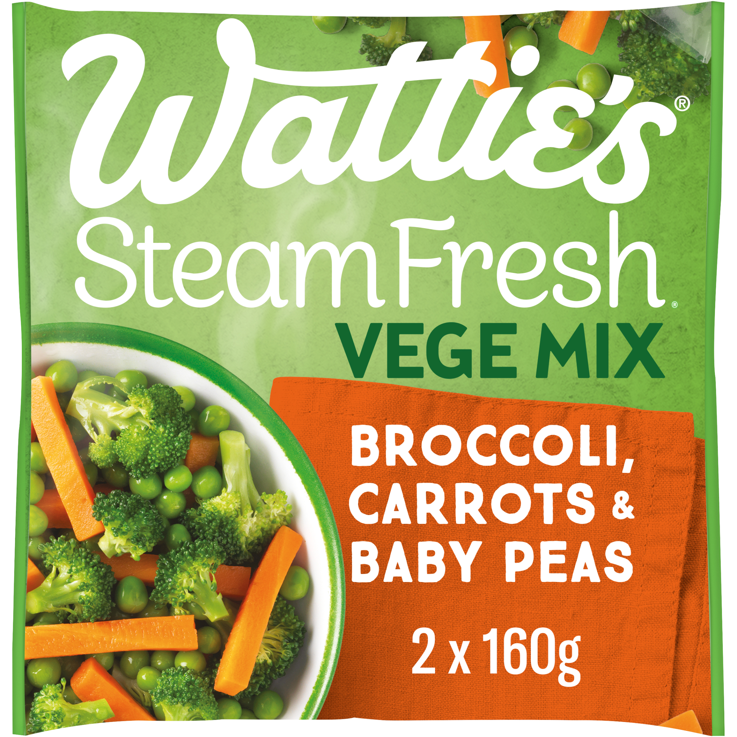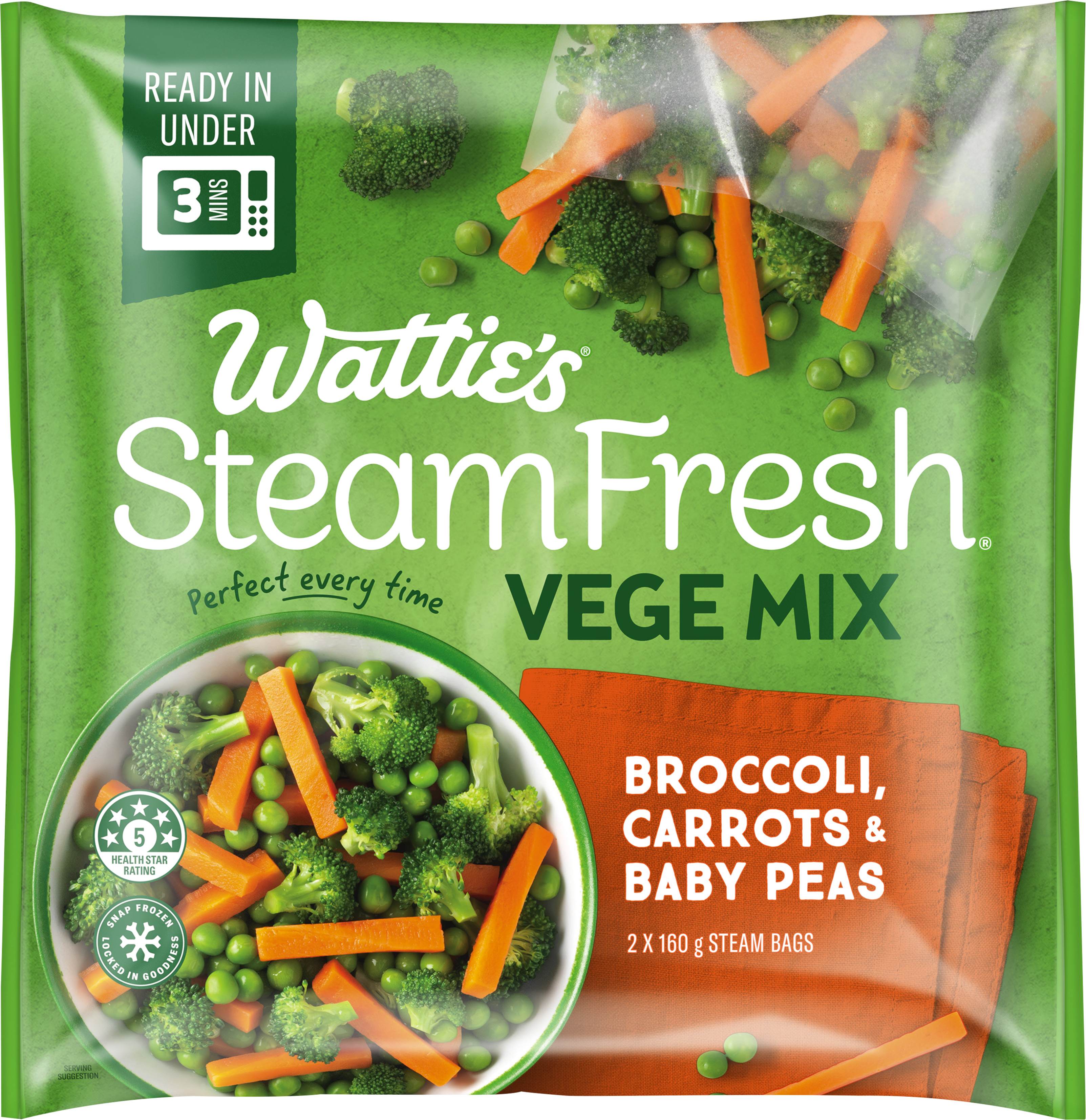 Broccoli, carrot and baby peas that are picked, snap-frozen, then sealed in our special steam bags to lock in their goodness. Wattie's® SteamFresh®...