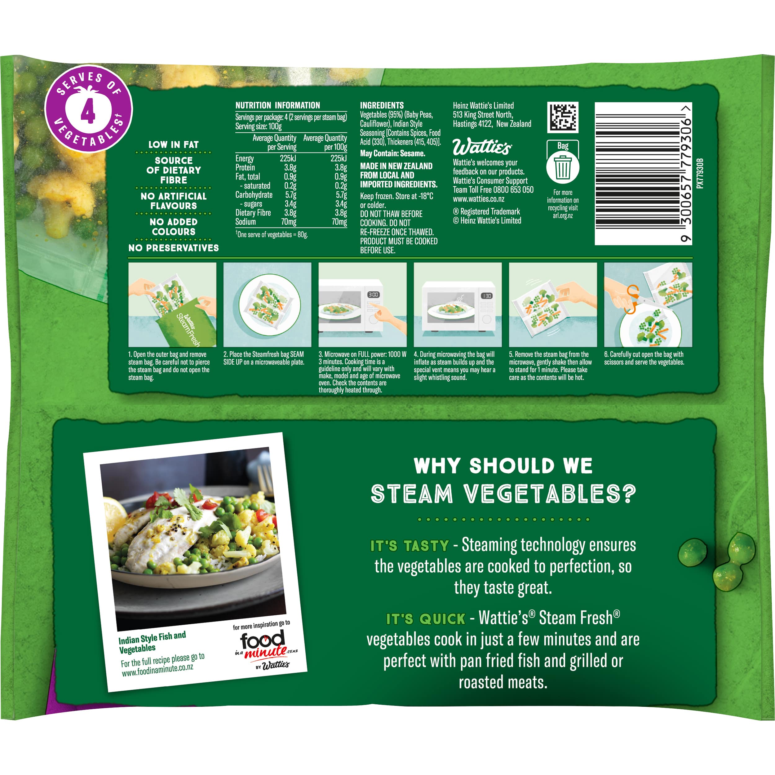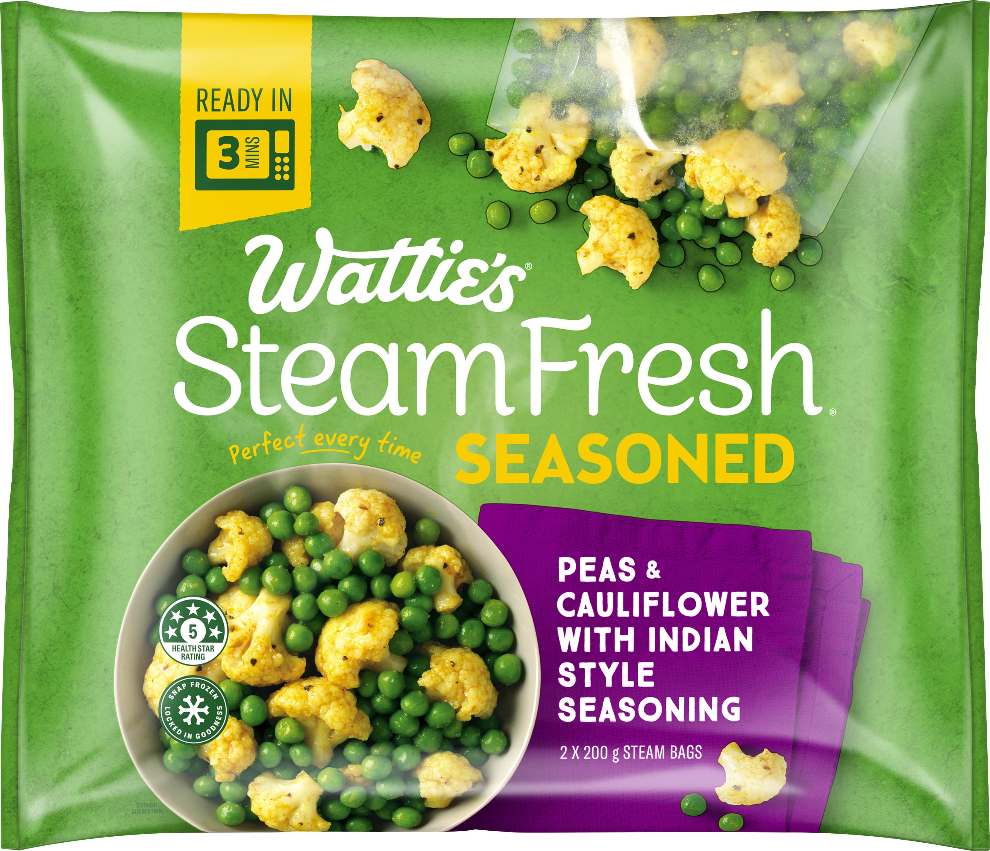Made with no artificial flavours and no added colours, Wattie's® SteamFresh® Peas & Cauliflower with Indian Style Seasoning is a tasty mix of snap frozen vegetables with a blend of spicy flavours. Perfect alongside any of a variety of pan fried, grilled or roasted meats and fish. Wattie's® SteamFresh® Peas & Cauliflower with Indian Style Seasoning contains no artificial flavours, no added colours and no preservatives. Each 400g package consists of 2 x 200g steam bags for 4 servings in total. This versatile mix pairs perfectly with grilled or roasted meats, pan fried fish and other hearty foods. • Low in fat • Source of dietary fibre • No artificial flavours • No added colours • No preservatives