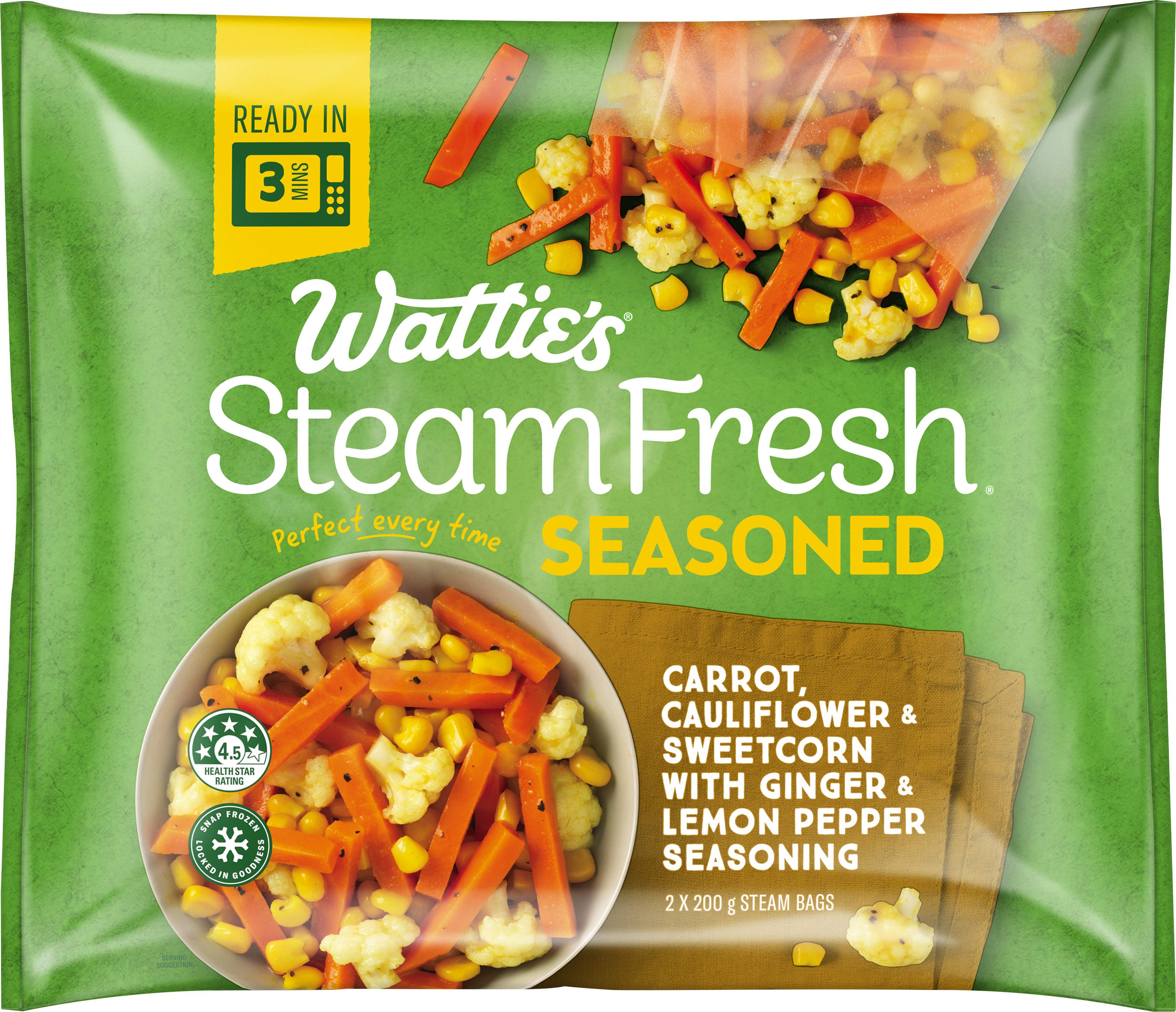 Wattie's® SteamFresh® Carrot, Cauliflower & Sweetcorn with Ginger & Lemon Pepper Seasoning is a crunchy and flavourful mix providing 4 serves of vegetables per pack (One serve of vegetables = 80g). Low in fat and ready in just a few minutes, it’s a perfect vegetable addition to any dinner table or work lunch. Providing a source of dietary fibre, Wattie's® SteamFresh® Carrot, Cauliflower & Sweetcorn with Ginger & Lemon Pepper Seasoning offers 4 serves of vegetables per 400g pack (One serve of vegetables = 80g). These vegetables are snap frozen for locked in goodness and packed with no artificial flavours, no added colours and no preservatives. Pair this crunchy mix with any grilled or roasted meats, pan fried fish and other add to a veggie casserole. • Low in fat • Source of dietary fibre • No artificial flavours • No preservatives • No added colours
