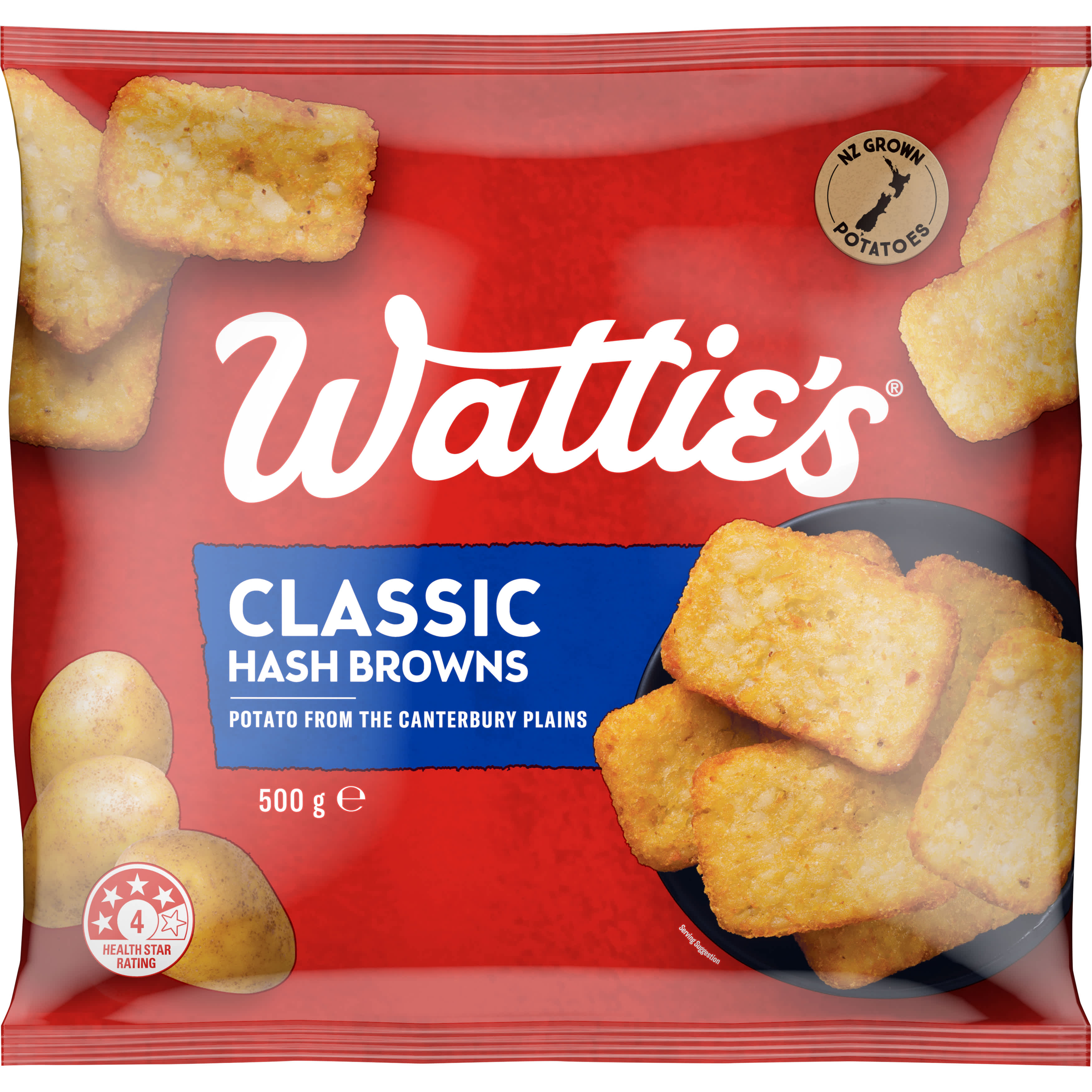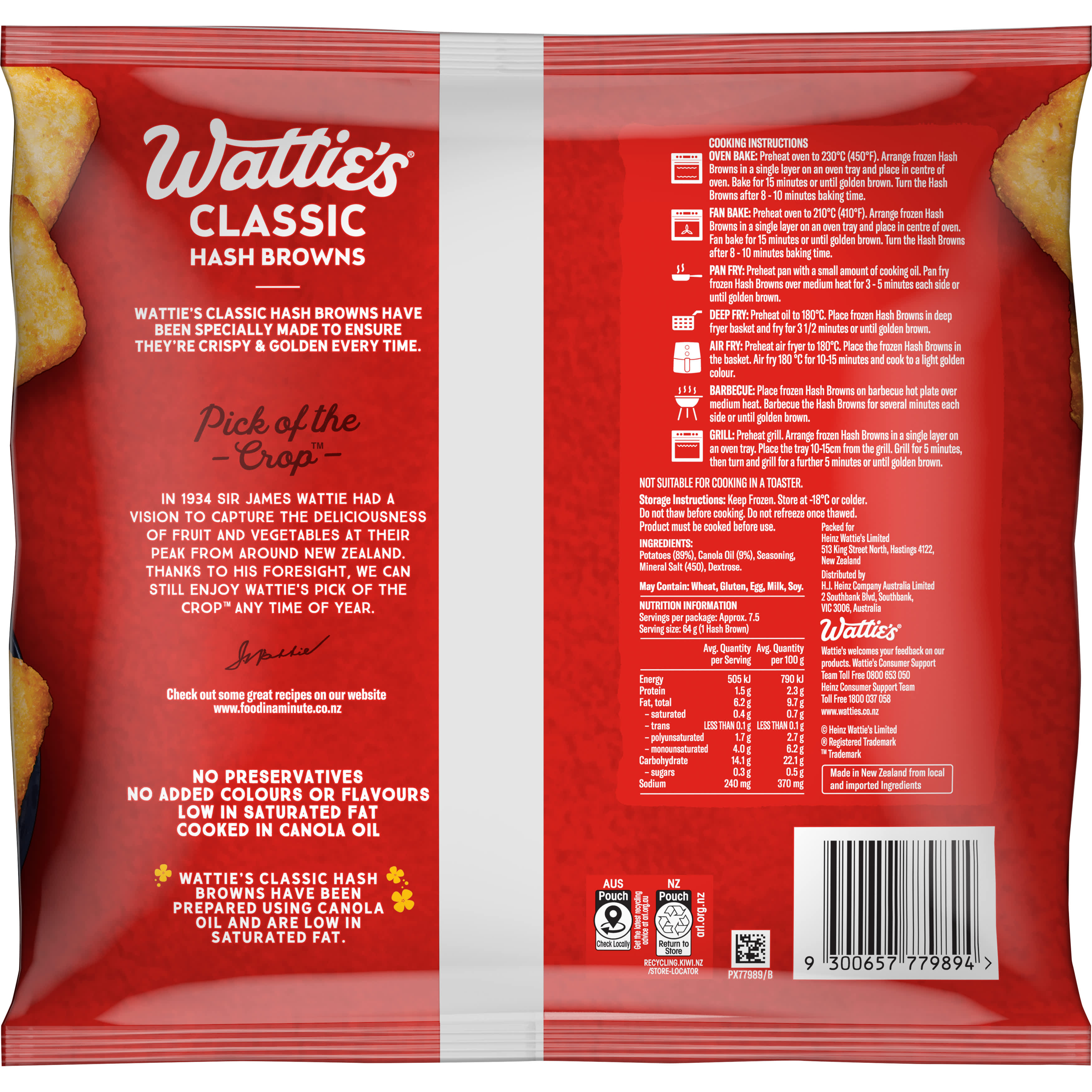 Cooked in canola oil, Wattie's®️ Classic Hash Browns are low in saturated fat and made with no added colours or flavours and no preservatives. Add a...