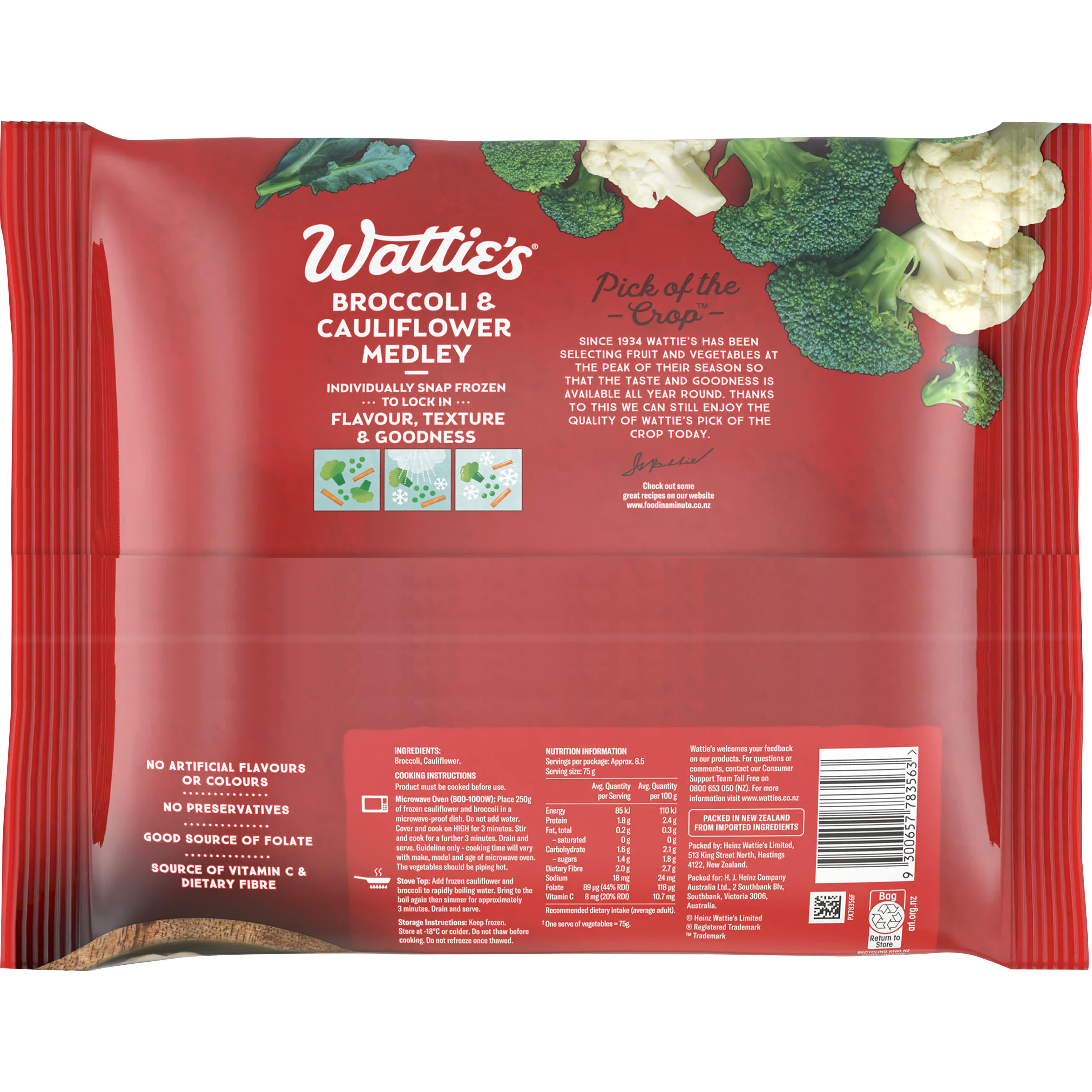 Wattie's®️ Broccoli & Cauliflower Medley is an easy way to sneak more vegetables into your favourite recipes. Providing 8.5 serves of veg per pack (one serve of vegetables = 75g), these tasty florets are a good source of folate as well as a source of vitamin C and dietary fibre. Individually snap-frozen for maximum freshness, Wattie's®️ Broccoli & Cauliflower Medley contains no artificial colours or flavours and no preservatives. From quick and easy stir-fries to delicious casseroles, these florets are a versatile ingredient that offers endless possibilities in the kitchen. Pair with olive oil and parmesan for a tasty meal you can enjoy on its own. • 8.5 serves of vegetables per pack (one serve of vegetables = 75g) • Good source of folate • Source of vitamin C and dietary fibre • No artificial colours or flavours and no preservatives • 5 Health Star Rating