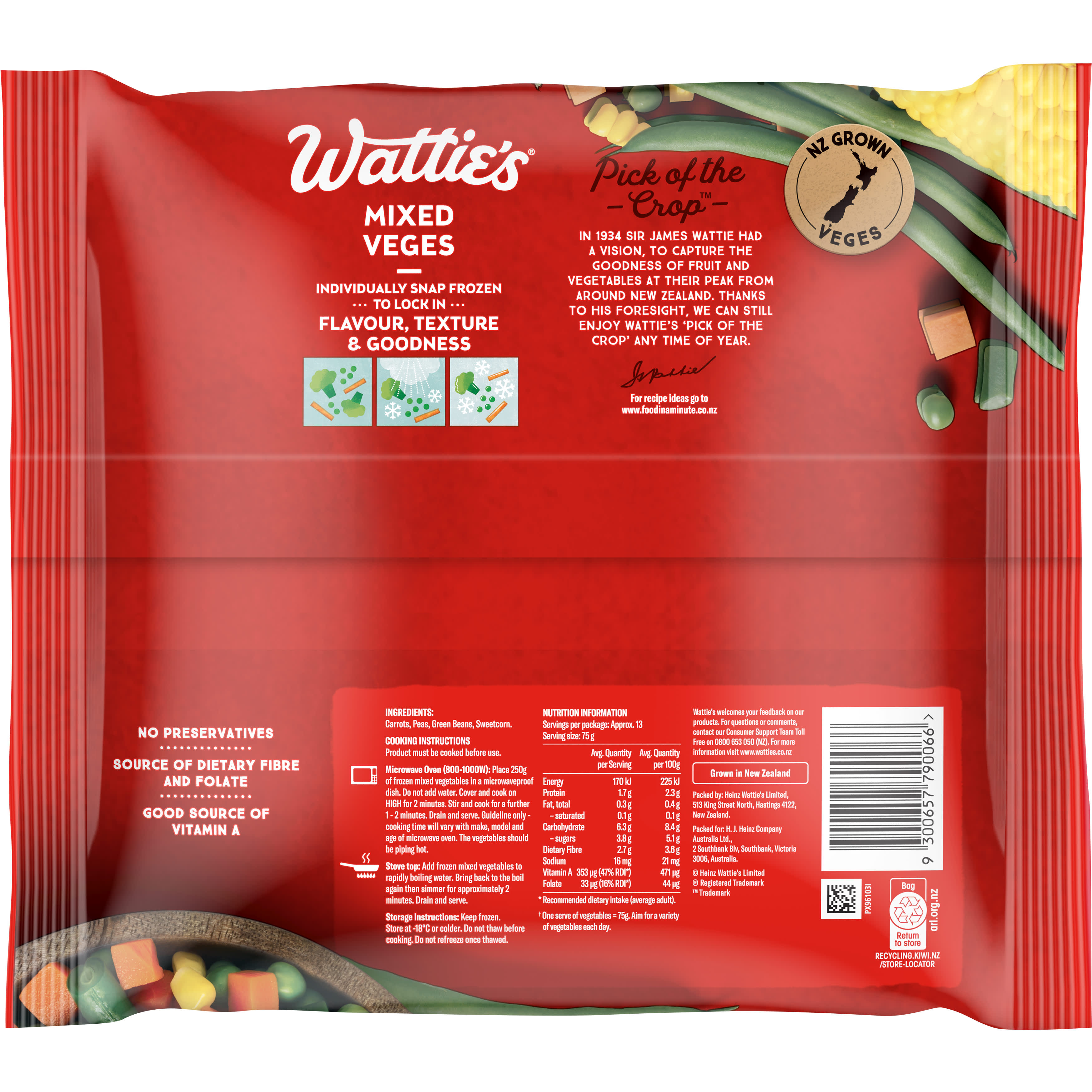 Snap frozen and grown in New Zealand, Wattie's® Mixed Vegetables are a natural source of Vitamin A, fibre and folate. Wattie's® Mixed Veges includes...
