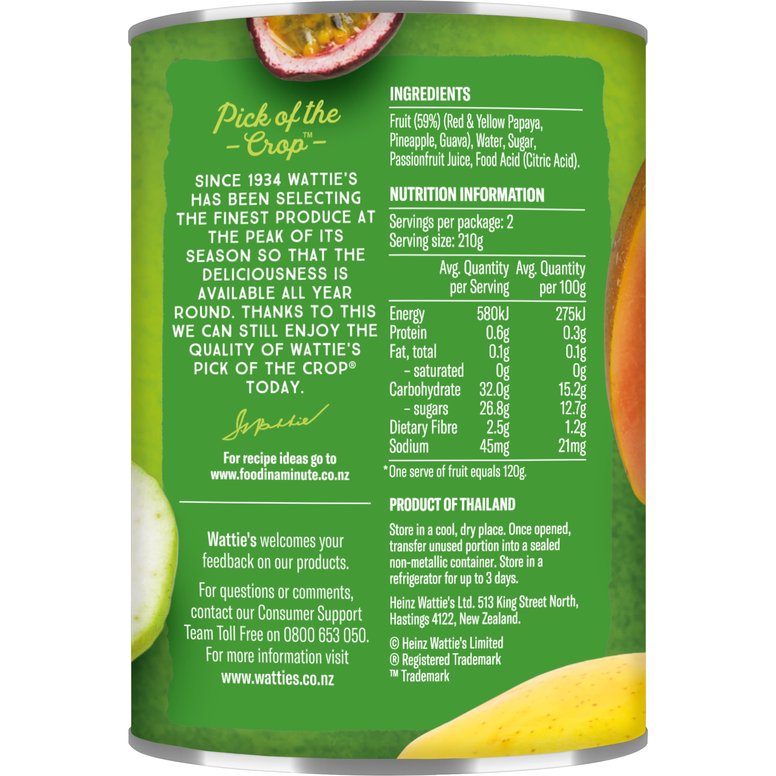 Wattie’s® Tropical Fruit Salad in Light Syrup includes juicy pieces of papaya, pineapple and guava. This is a delicious sweet treat to enjoy as a snack or dessert. Enjoy tropical fruit all year round with this tropical fruit salad with Pick of the Crop™ fruit. Wattie’s® Tropical Fruit Salad in Light Syrup is a delicious source of dietary fibre and contains no added flavours, colours or preservatives. Bake into an upside down fruit cake, mix with your favourite plain yoghurt or simply serve straight out of the can. • Source of dietary fibre • No added colours • No added flavours • No preservatives • 2 serves of fruit in every can (One serve of fruit equals 120g)