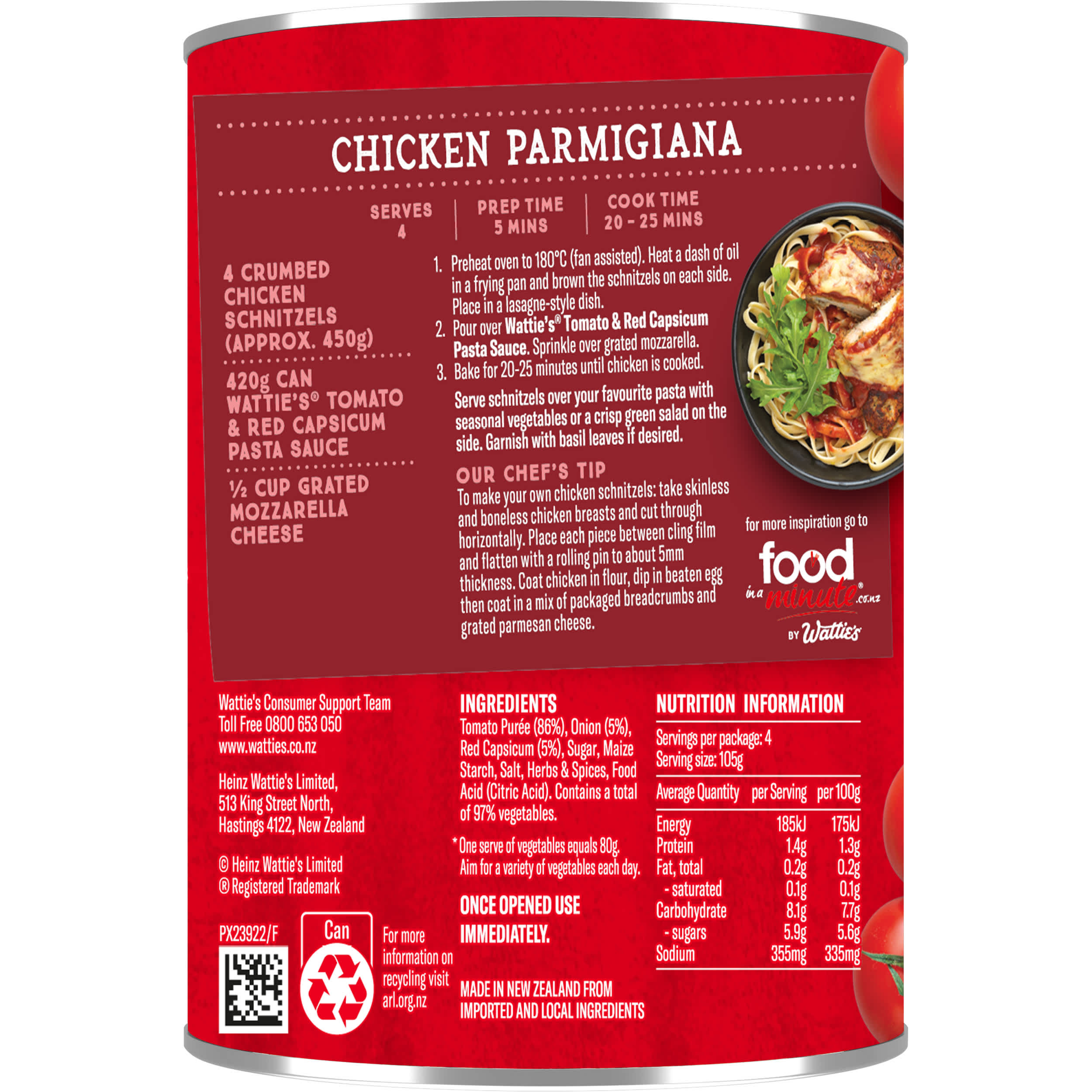 A slight twist on classic, tomato-based pasta favourites bring extra flavour to every bite. Wattie's® Tomato & Red Capsicum Pasta Sauce is deliciously rich, guaranteed to have your family wanting seconds at dinnertime. Cook mouth watering meals with Wattie's® Tomato & Red Capsicum Pasta Sauce. Perfect for fans of Italian food, this sauce is ideal for making chicken parmigiana, seafood marinara or baked lasagne. Turn meal preps into a breeze and add it to your kitchen essentials for a quick dinner or lunch option. • No added flavours • No added colours • No preservatives • 5 serves of veges per can (One serve of vegetable equals 80g. Aim for a variety of vegetables each day.) • Try adding it to chicken parmigiana