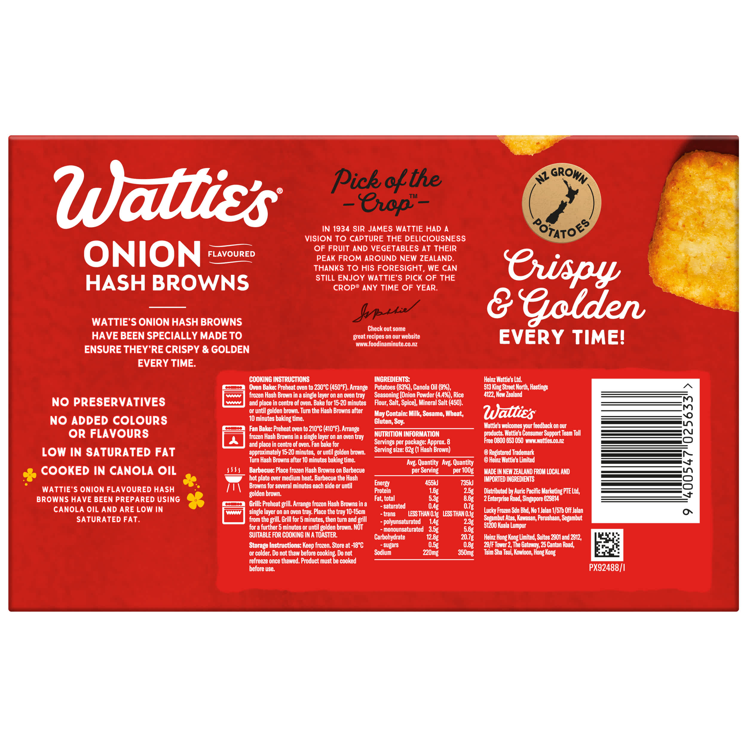 Wattie’s® onion flavoured rectangle hash browns. Wattie’s® Onion Hash Browns are delicious and crispy hash browns made from New Zealand potatoes and...