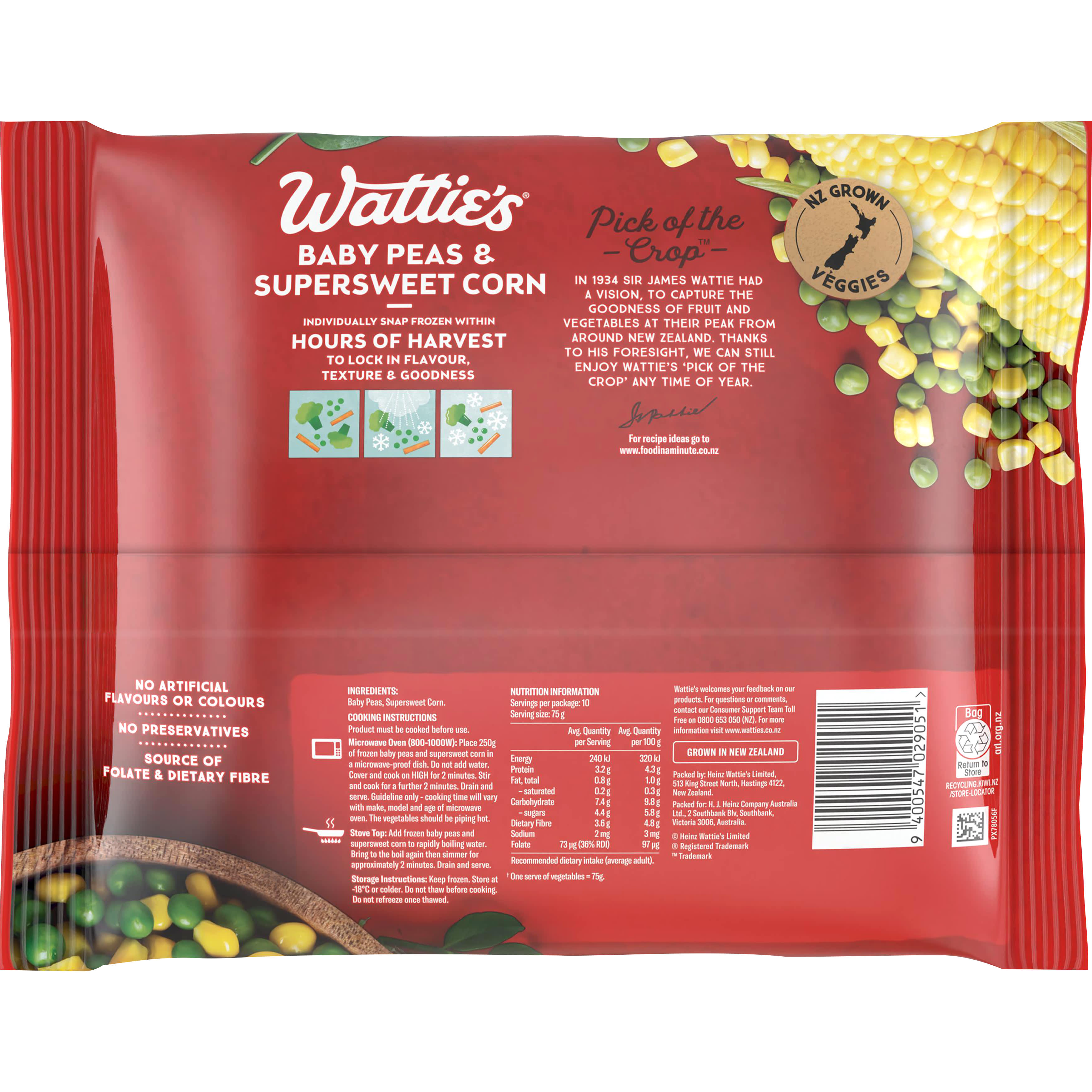 Enjoy the vibrant flavours of Wattie's®️ Baby Peas & Supersweet Corn, individually snap-frozen within hours of harvest. A source of folate and dietary...