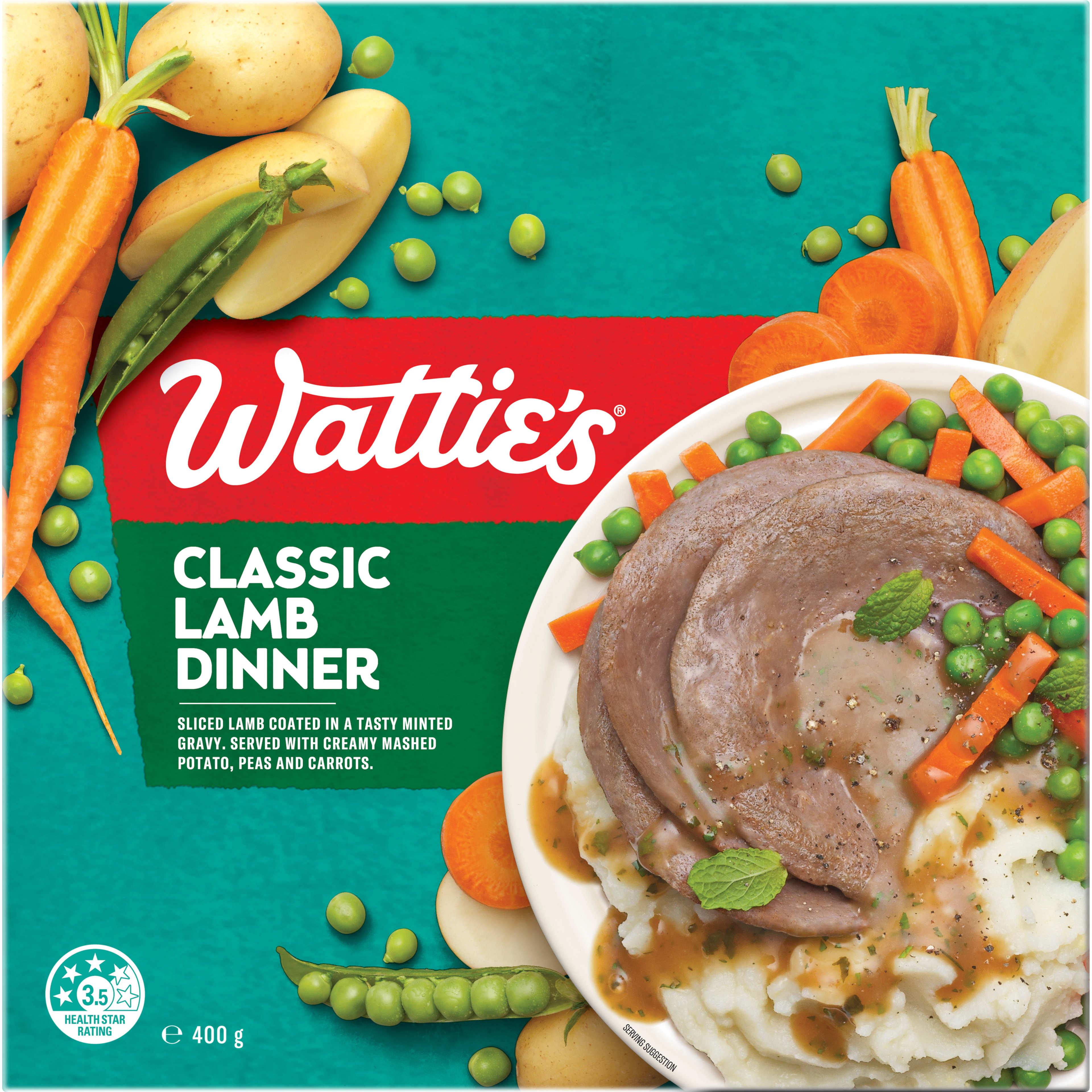 Sliced lamb coated in a tasty minted gravy with mashed potato, peas and carrots. Wattie's® Classic Lamb dinner is a classic Kiwi dinner. Treat yourself to a classic Kiwi dinner at home with Wattie's® Classic Lamb Dinner. Simply heat in the microwave or oven and enjoy this full dinner with mashed potato and vegetables. A great option for weeknight dinners. • Low in Fat • Good Source of Protein • Good Source of Dietary Fibre • Ideal size for one • Easy to prepare
