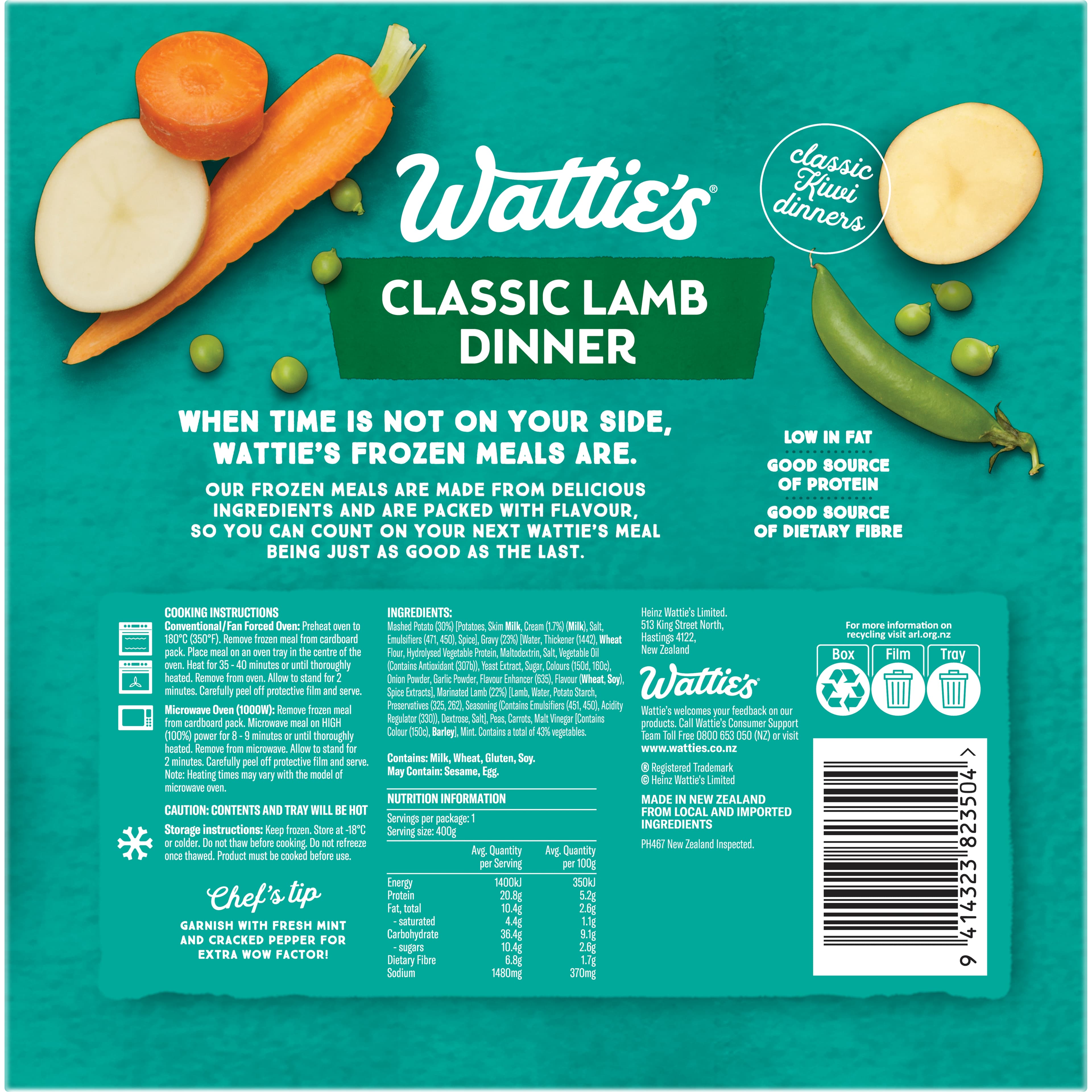 Sliced lamb coated in a tasty minted gravy with mashed potato, peas and carrots. Wattie's® Classic Lamb dinner is a classic Kiwi dinner. Treat...