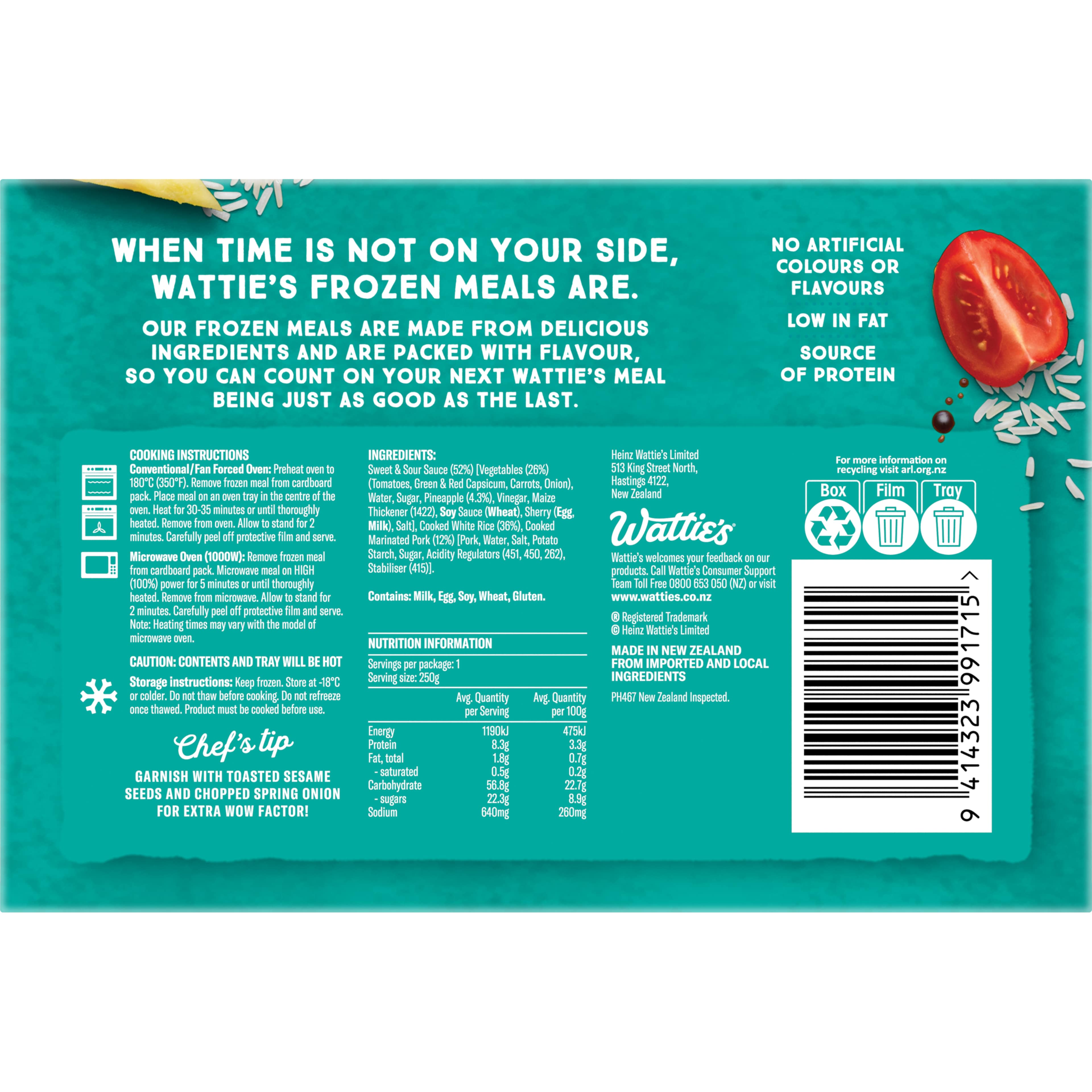 Pork pieces and vegetable in a tasty sweet & sour sauce, served with white rice. Wattie's® Sweet & Sour Pork is a delicious meal for one that provides...