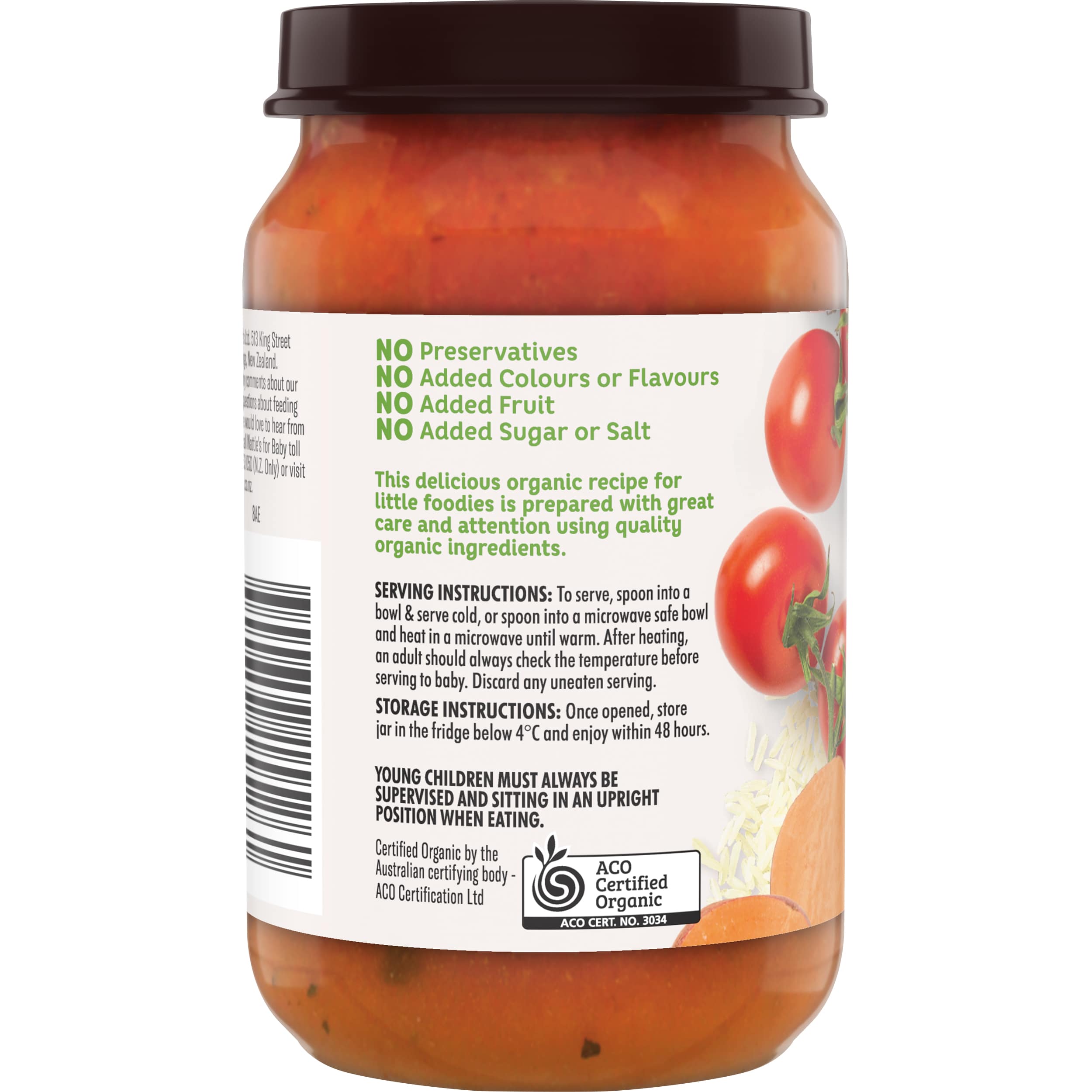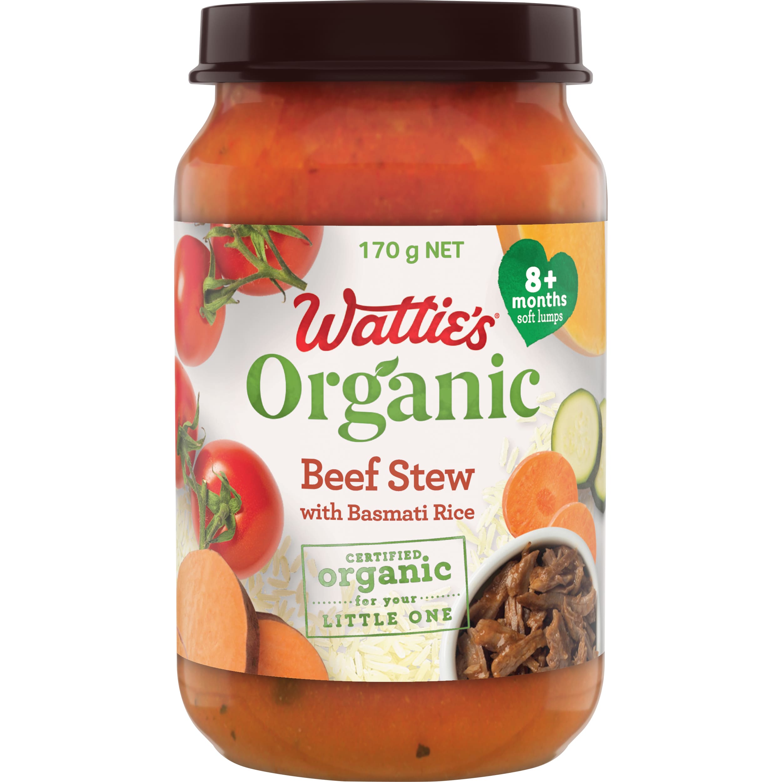 Organic vegetables with beef and basmati rice suitable for ages 8+ months. Wattie’s® Organic Beef Stew with Basmati Rice contains no preservatives and no added sugar or salt. Wattie’s® Organic Beef Stew with Basmati Rice has a soft lumps texture, suitable for babies 8 months and older. It's packed in a convenient and environmentally friendly jar, and can be easily served cold with a spoon or warmed in a microwaveable bowl. • Certified Organic for your little one • No preservatives • No added colours or flavours • No added fruit, sugar or salt • Soft lumps suitable for babies 8 months and older