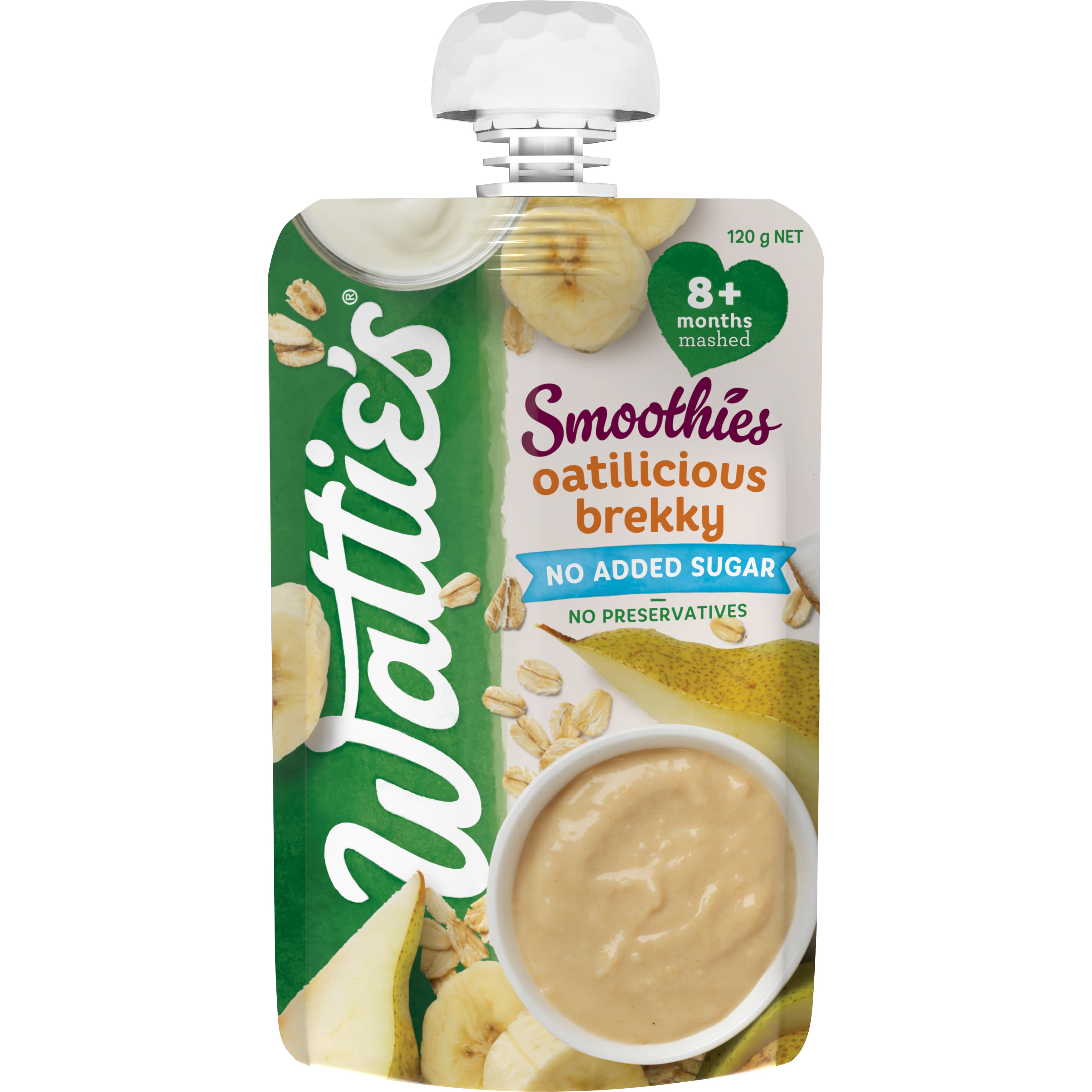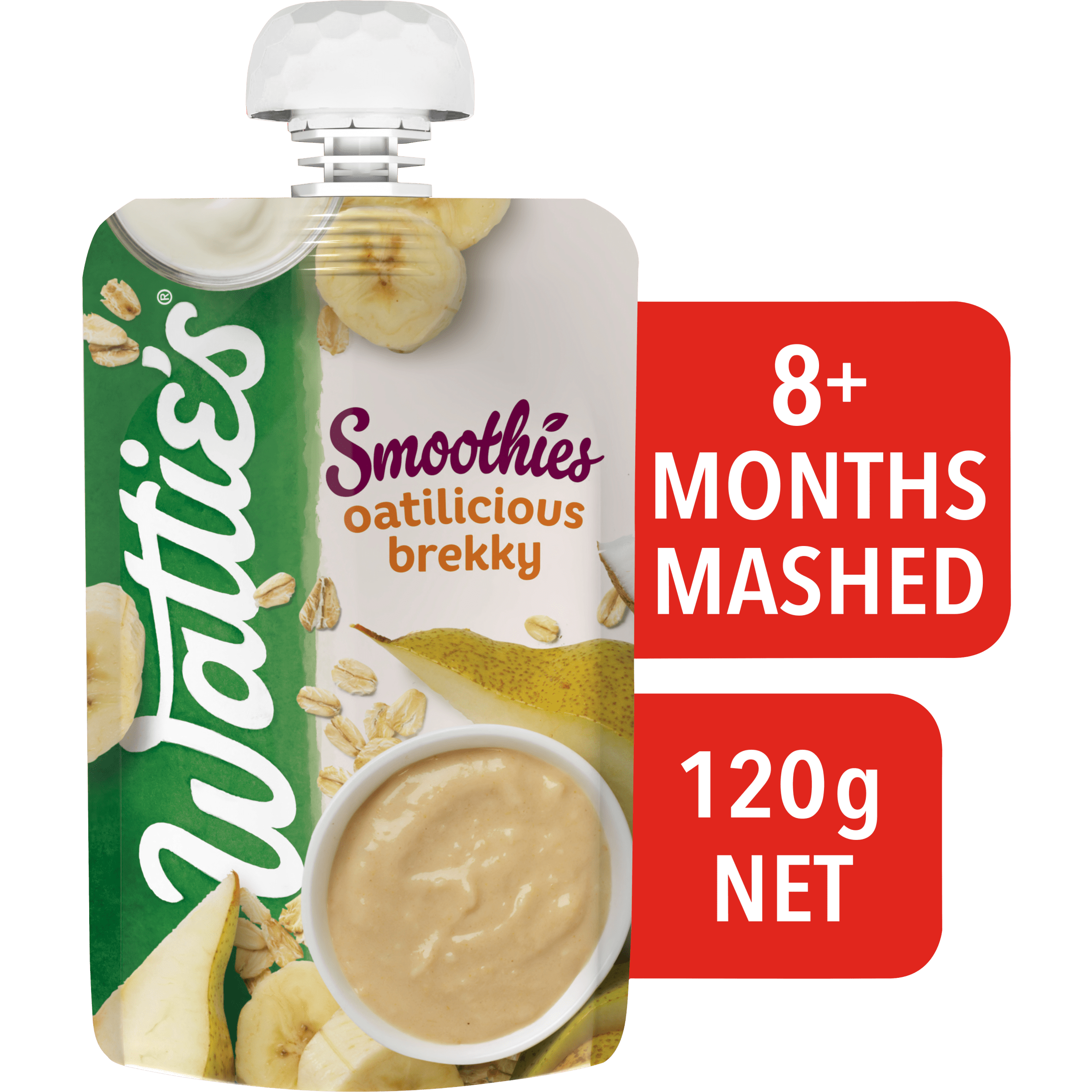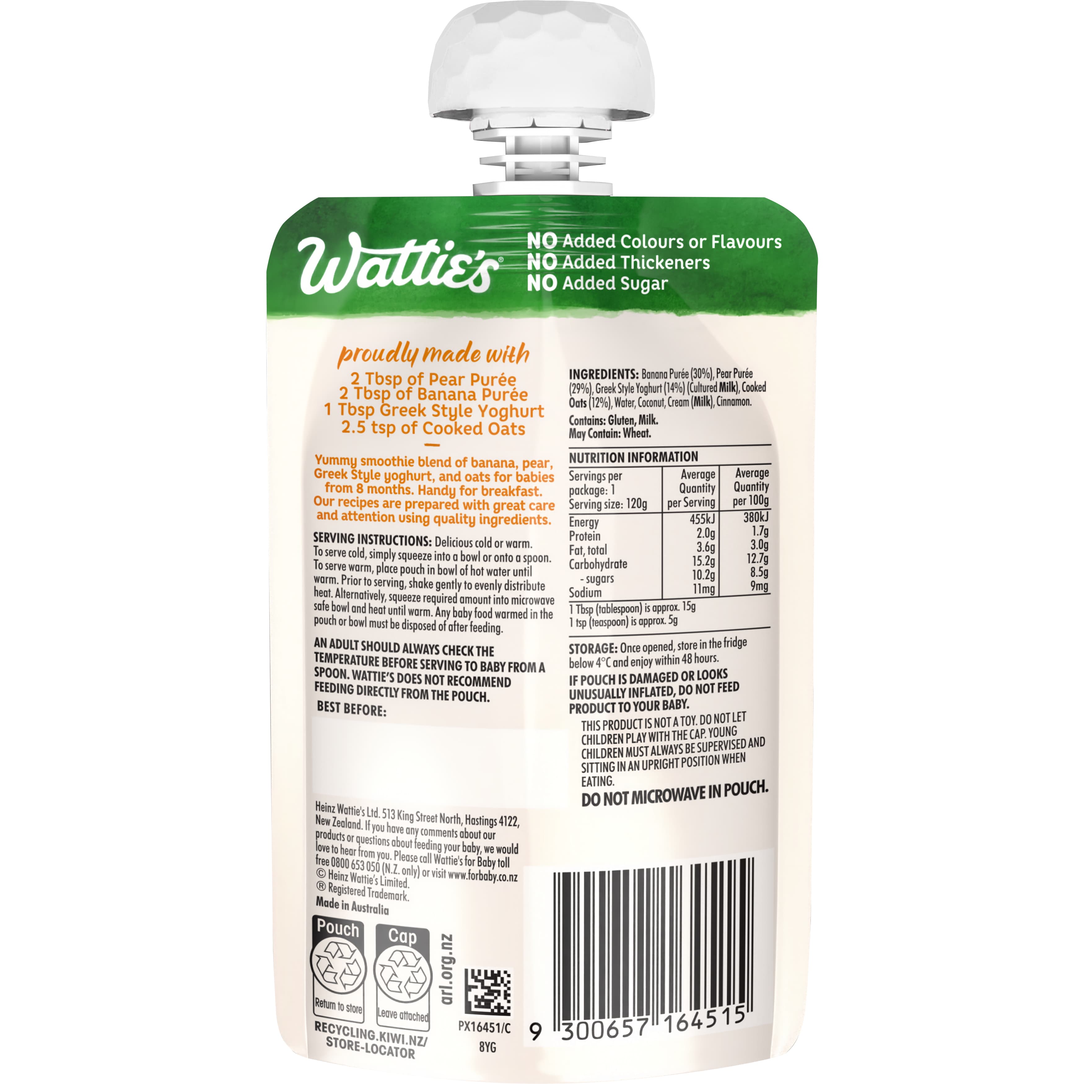 Created especially for babies aged 8 months or older, Wattie's® Smoothies Oatilicious Brekky is made with banana and pear purée, plus oats and Greek style yoghurt. This is a handy and convenient option for breakfast or snacks on the go. This yummy smoothie for ages 8+ months will make your mornings a breeze. Prepared with quality ingredients and no added colours, flavours, thickeners or sugar, Wattie's® Smoothies Oatilicious Brekky is easy to serve cold with a spoon and can be heated in the pouch in a bowl of hot water as well. • For ages 8 months onwards • No preservatives • No added colours or flavours • No added thickeners • No added sugar