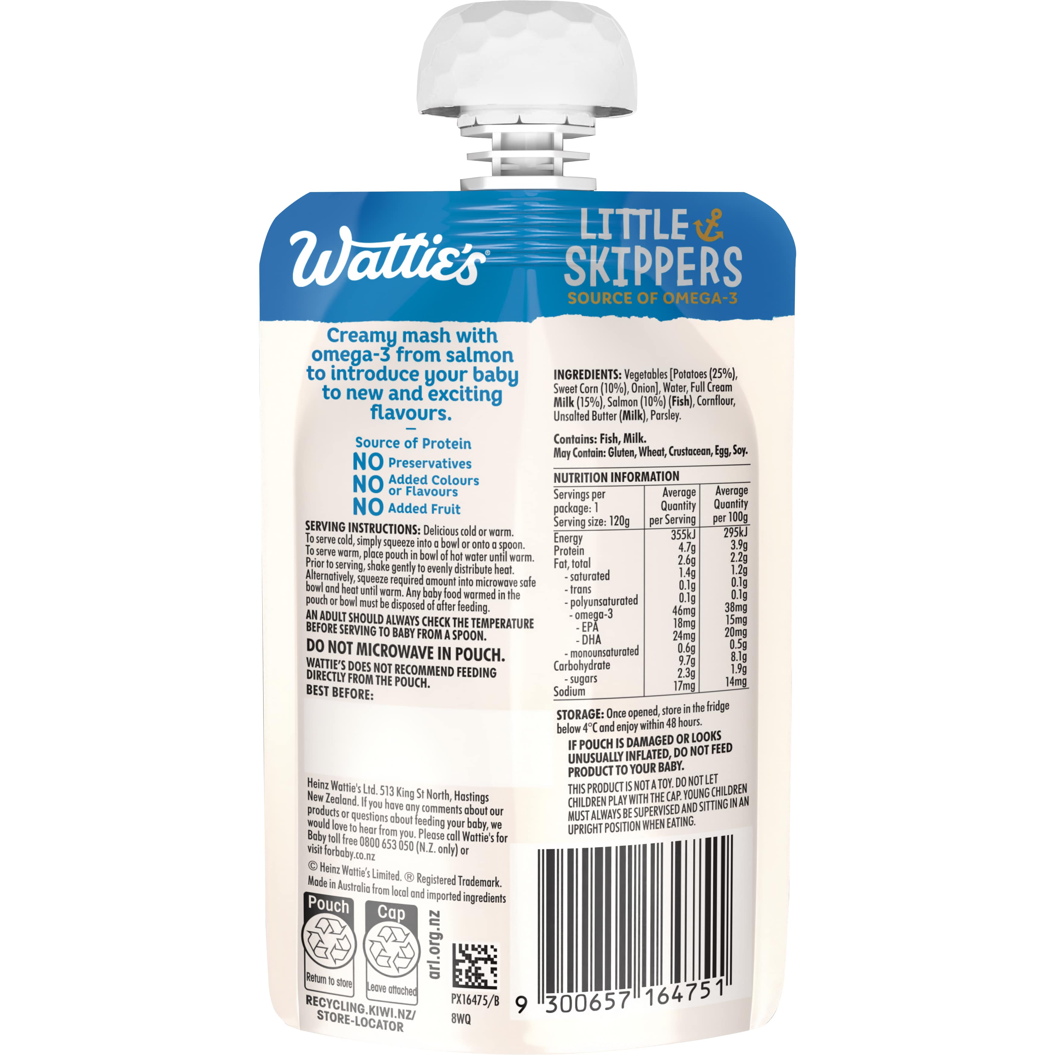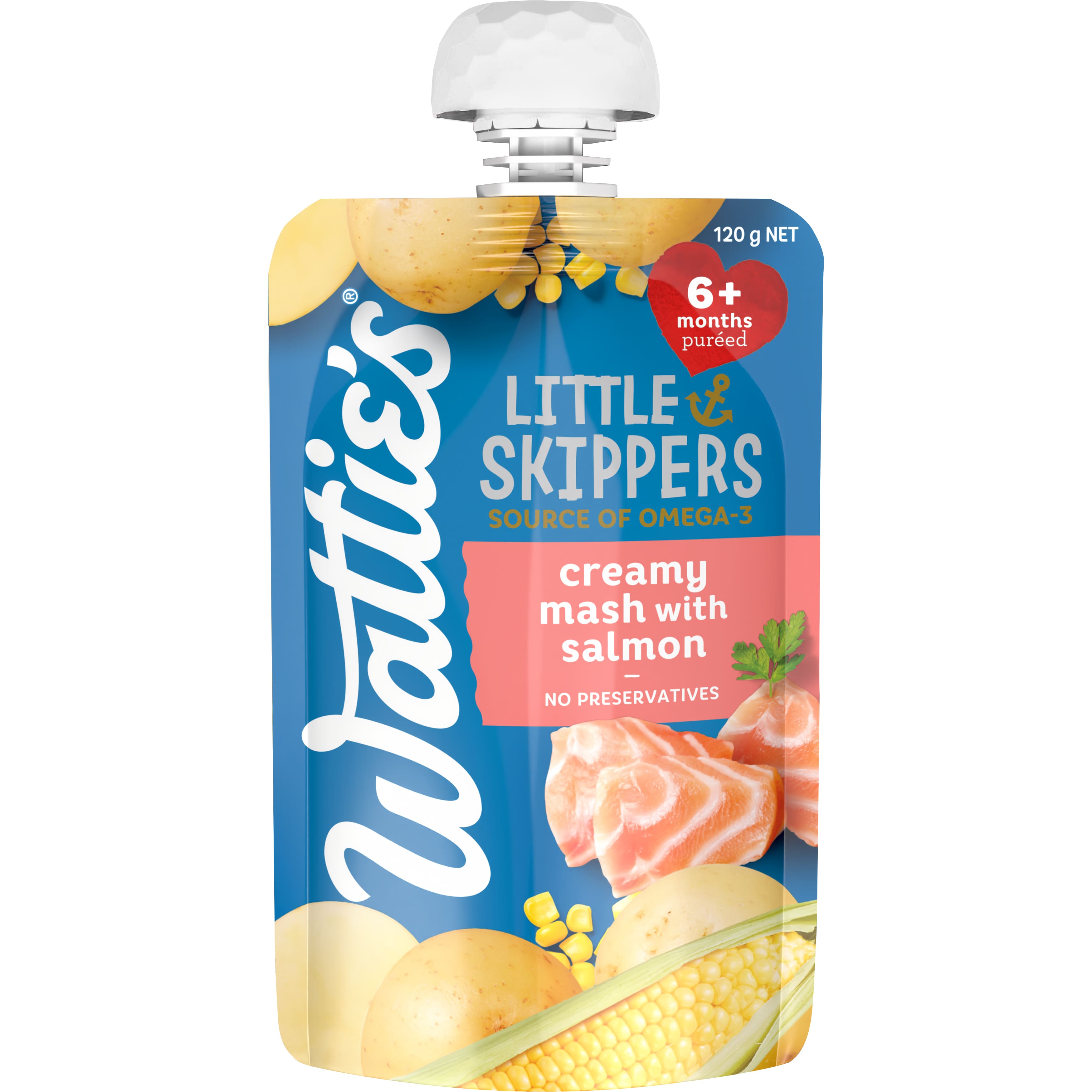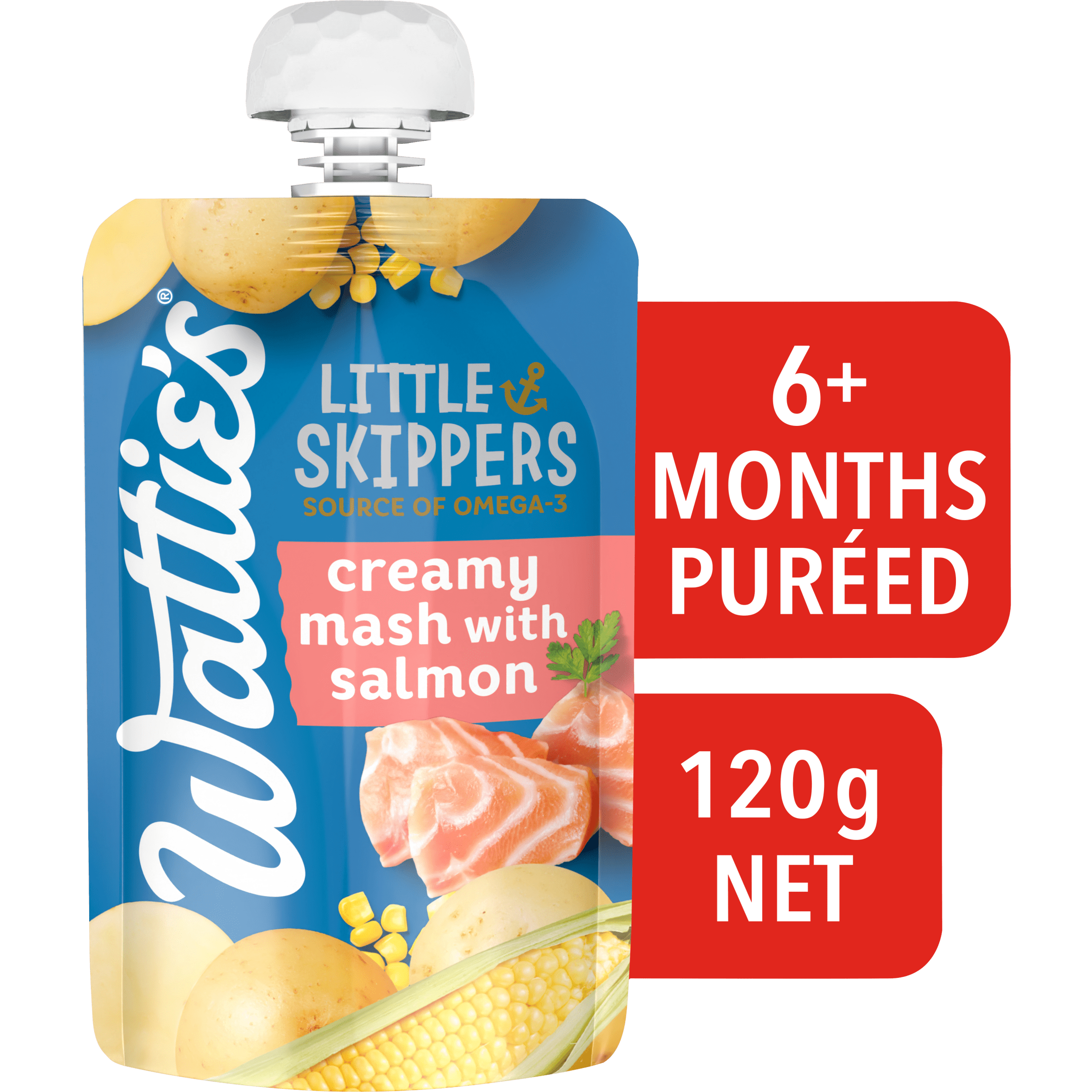 Wattie's® Little Skippers Creamy Mash with Salmon provides an exciting introduction to new flavours and textures for your little one. This tasty puréed meal is designed for ages 6+ months. Providing a source of both protein and Omega-3, Wattie's® Little Skippers Creamy Mash with Salmon is a great option for lunch or dinner for your child. It's delicious warm or cold, so you can serve it with a spoon on the go or heat the pouch in a bowl of hot water until warm before serving. Wattie's® Little Skippers Creamy Mash with Salmon contains no preservatives, no added colours or flavours and no added fruit too. • Source of Omega-3 • For ages 6+ months • Source of protein • No preservatives • No added colours or flavours