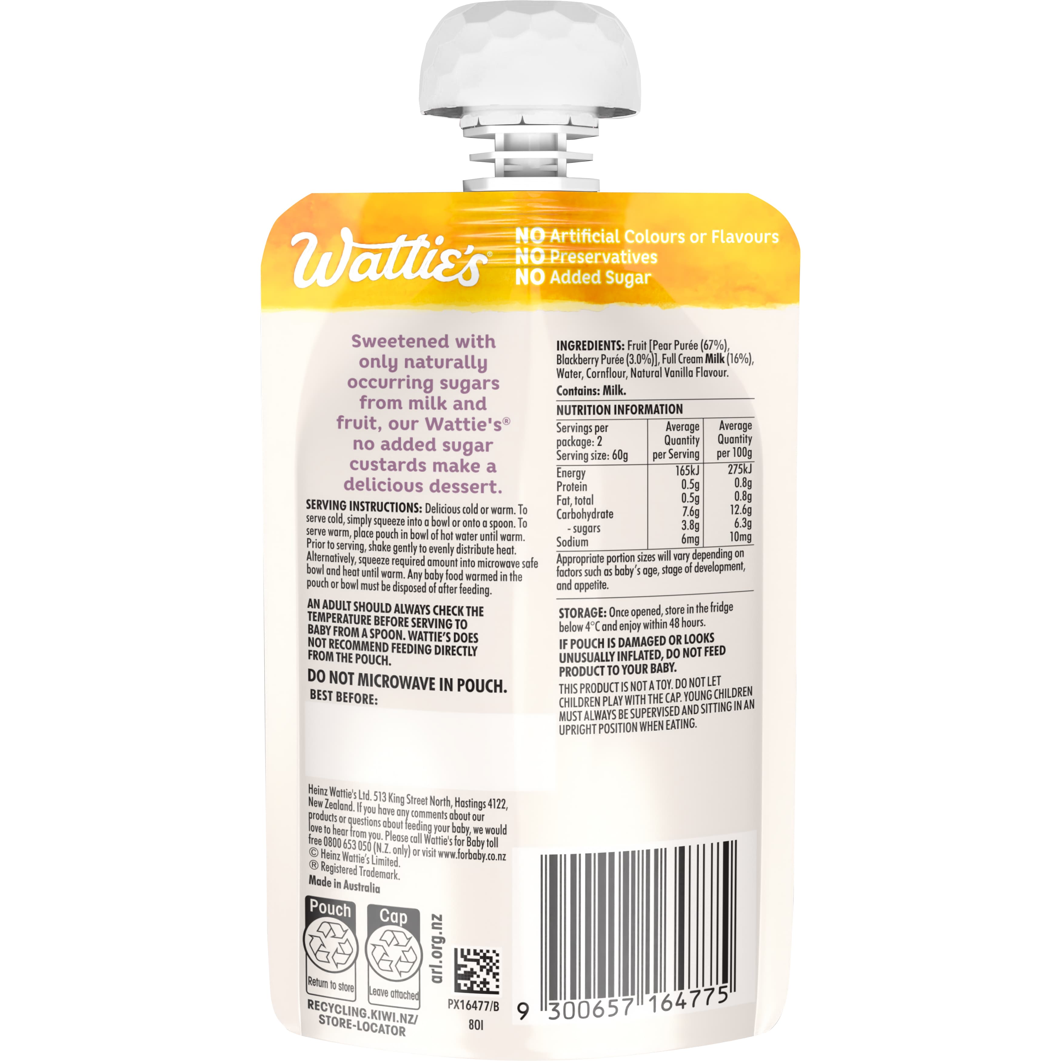 Made with no added sugar, Wattie's® Pear & Blackberry Custard is a fun and delicious occasional treat for your little one. Serve cold in a bowl or...