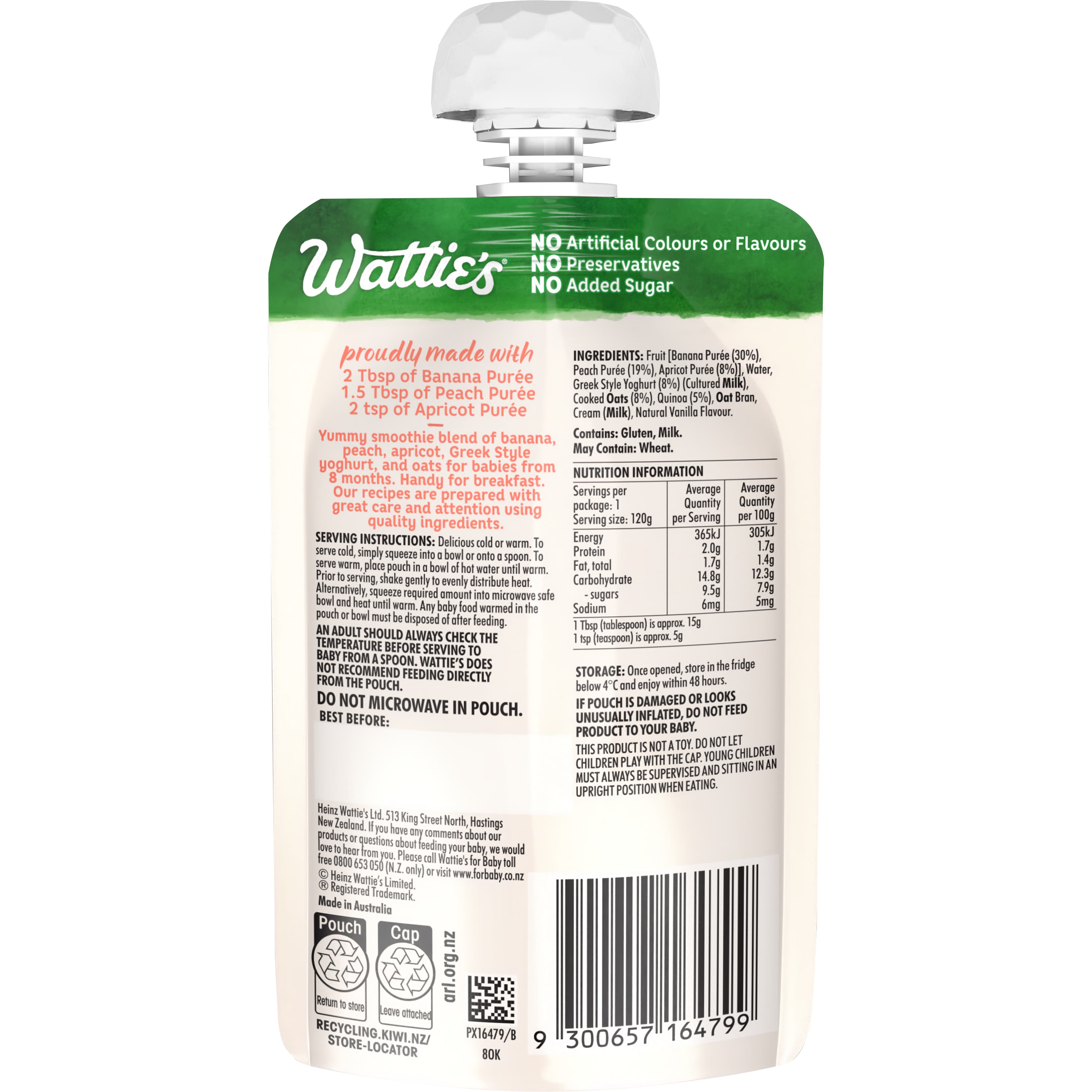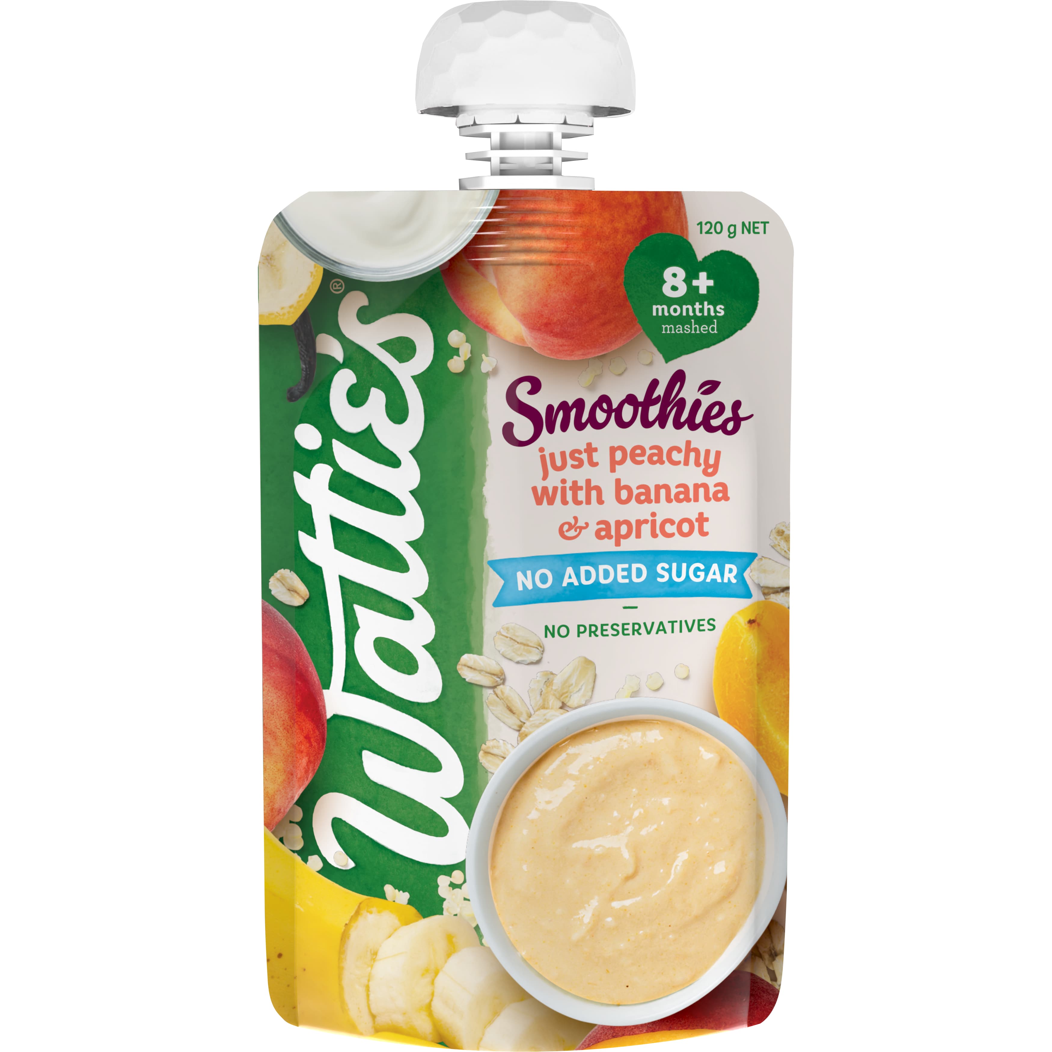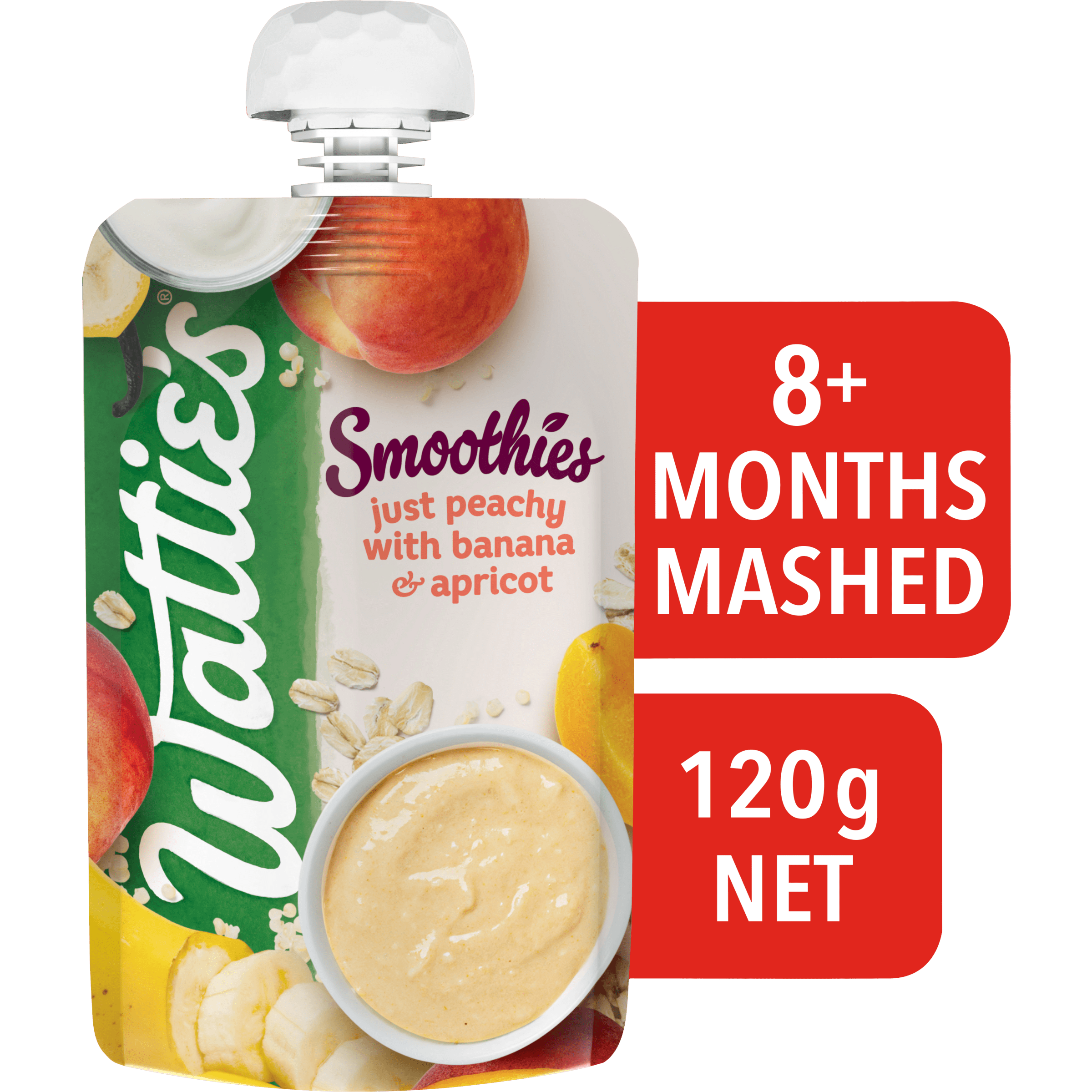 Wattie's® Smoothies Just Peachy with Banana & Apricot, blends banana, peach, apricot, Greek Style yoghurt and oats into a tasty breakfast for babies...