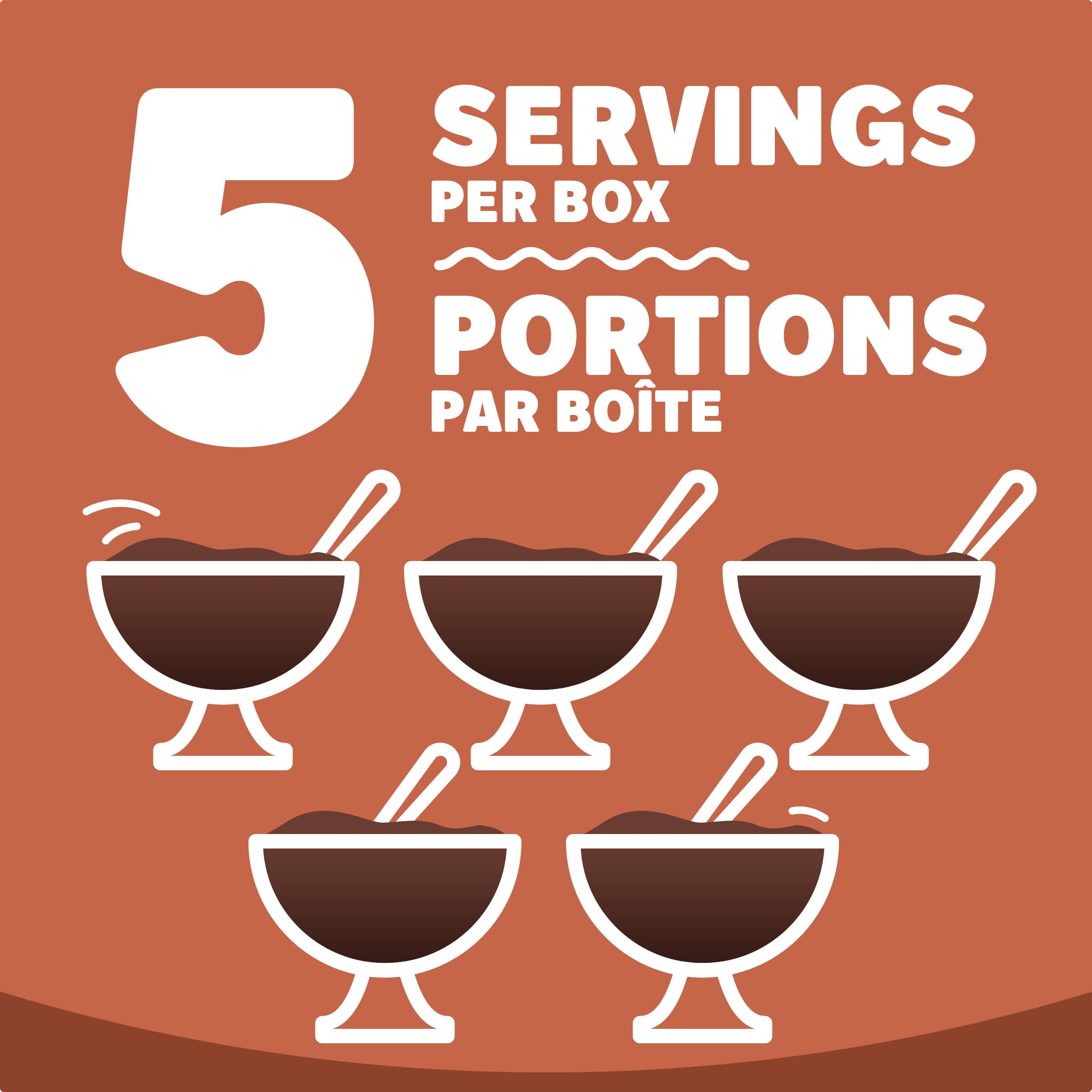 Une collation avec le sourire. Le mélange de pouding instantané Jell-O chocolat a un goût délicieux que vous l'appréciez comme une friandise ou que vous l'utilisiez comme ingrédient dans vos recettes préférées. Ajoutez un peu de magie à votre journée avec un délicieux dessert au chocolat. Essayez notre pouding au chocolat crémeux dans des gâteaux, des desserts, avec des fruits, garni de crème ou seul. Notre mélange de pouding au chocolat instantané est facile à préparer. Il suffit de verser deux tasses (500 mL) de lait froid dans le mélange de pouding, de battre pendant deux minutes, puis de laisser reposer pendant trois à cinq minutes, selon votre préférence personnelle pour la fermeté. Chaque mélange de pouding Jell-O est emballé dans un sachet scellé de 113 g et fait environ cinq portions. Découvrez la délicieuse saveur intemporelle du pouding Jell-O.