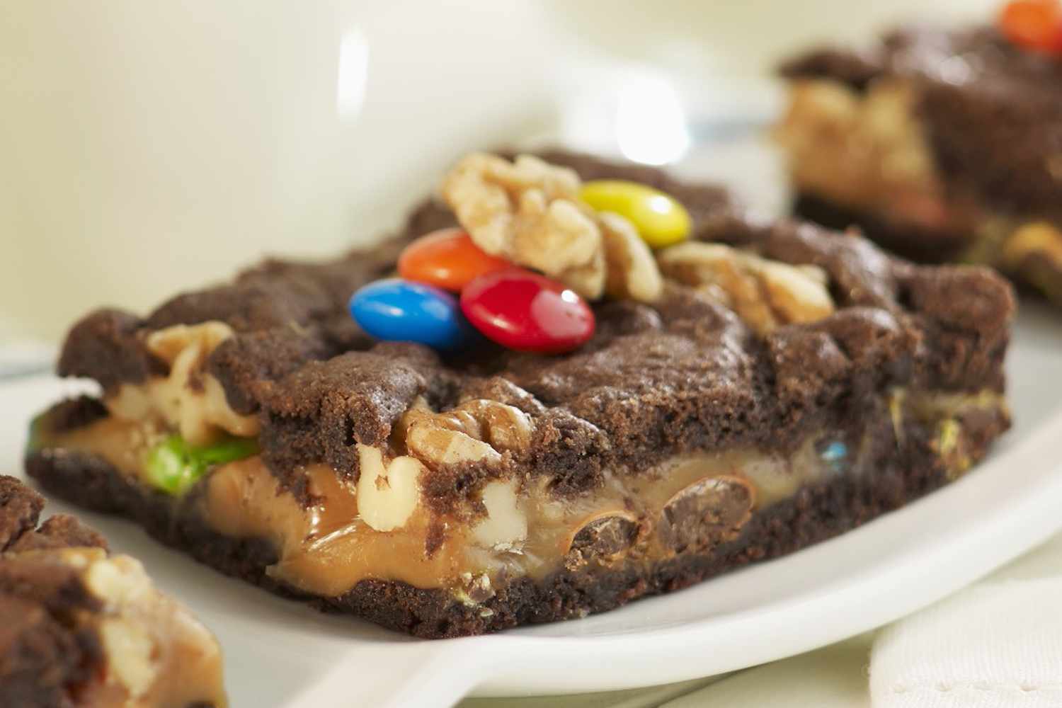 Tendres et fondants, ces délicieux brownies débordent de caramel, de noix et de bonbons au chocolat recouverts de sucre.