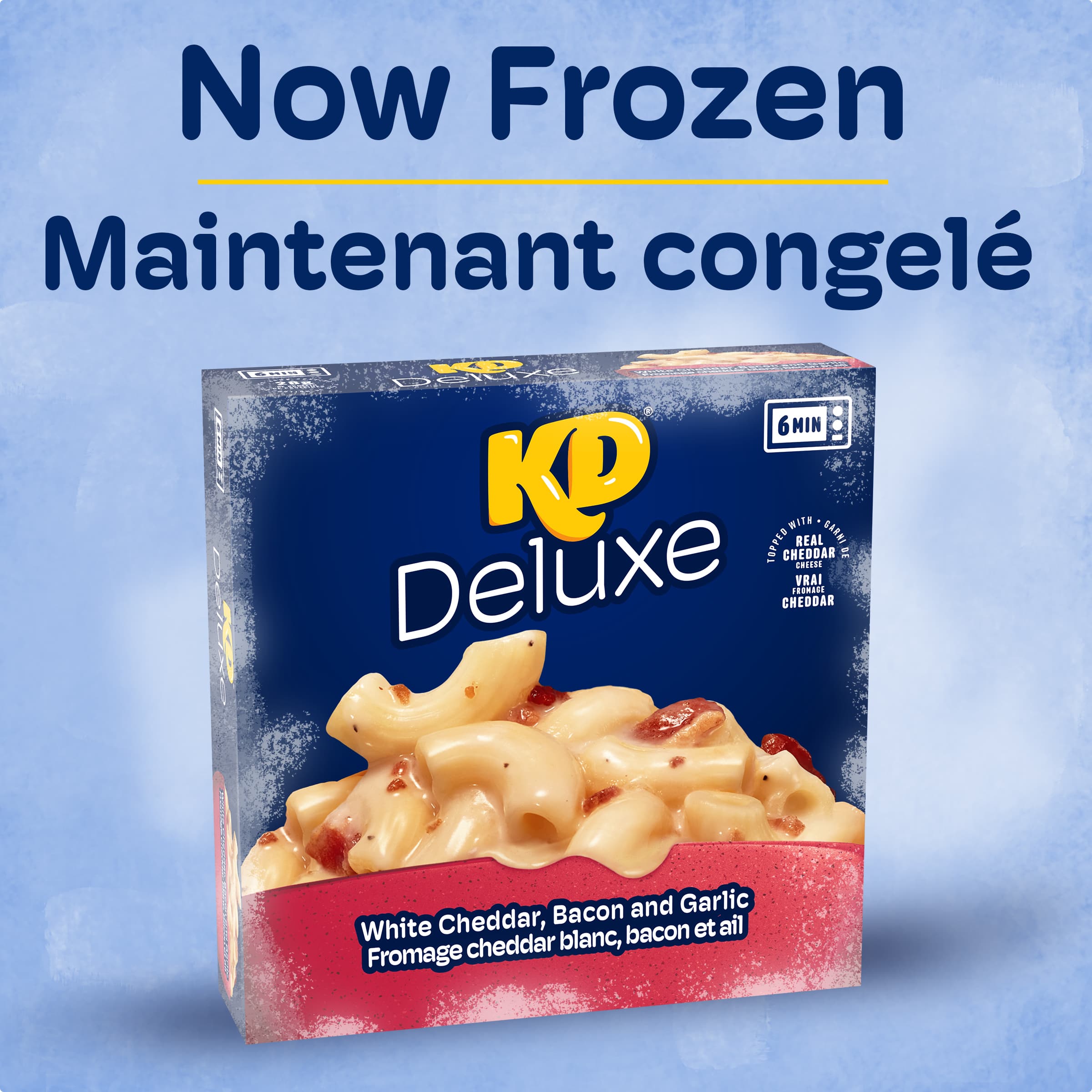 Confort Deluxe. Disponible dans le rayon des surgelés. Découvrez le plaisir ultime avec KD Deluxe au cheddar blanc, bacon et ail, un repas pratique...