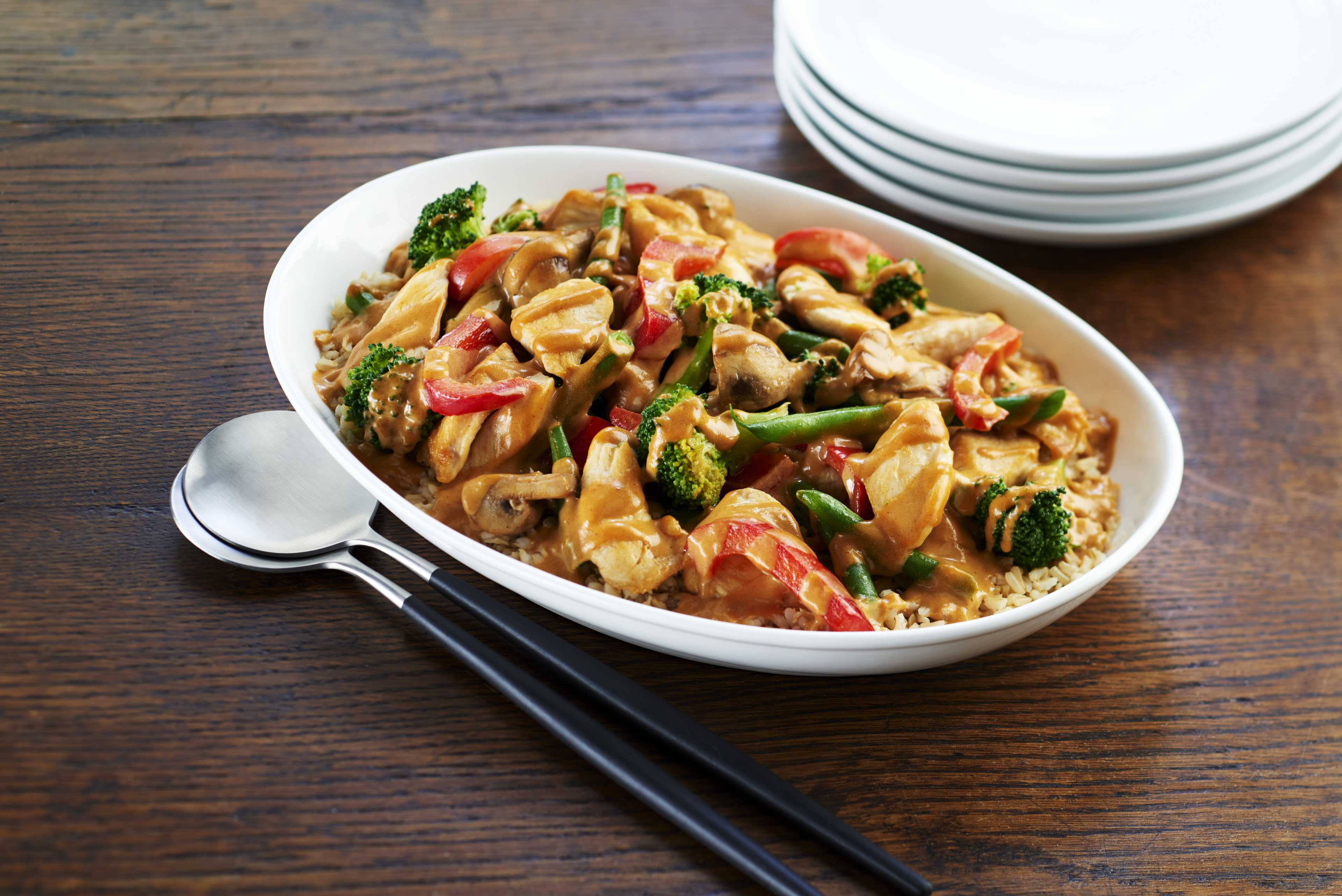 Mettre le riz dans une assiette; garnir du mélange de poulet et du reste de la sauce au beurre d'arachide.