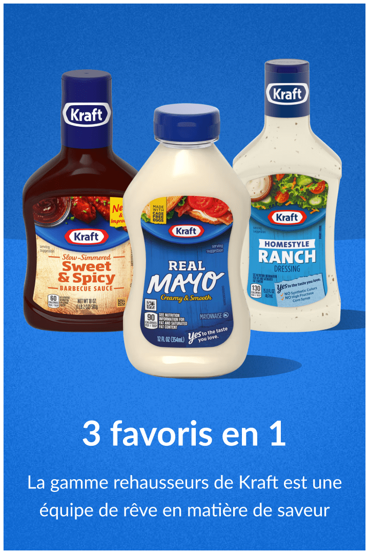 Quel que soit le plat, les rehausseurs Kraft vous proposent des sauces savoureuses créées pour travailler ensemble afin d’obtenir un maximum de saveur.