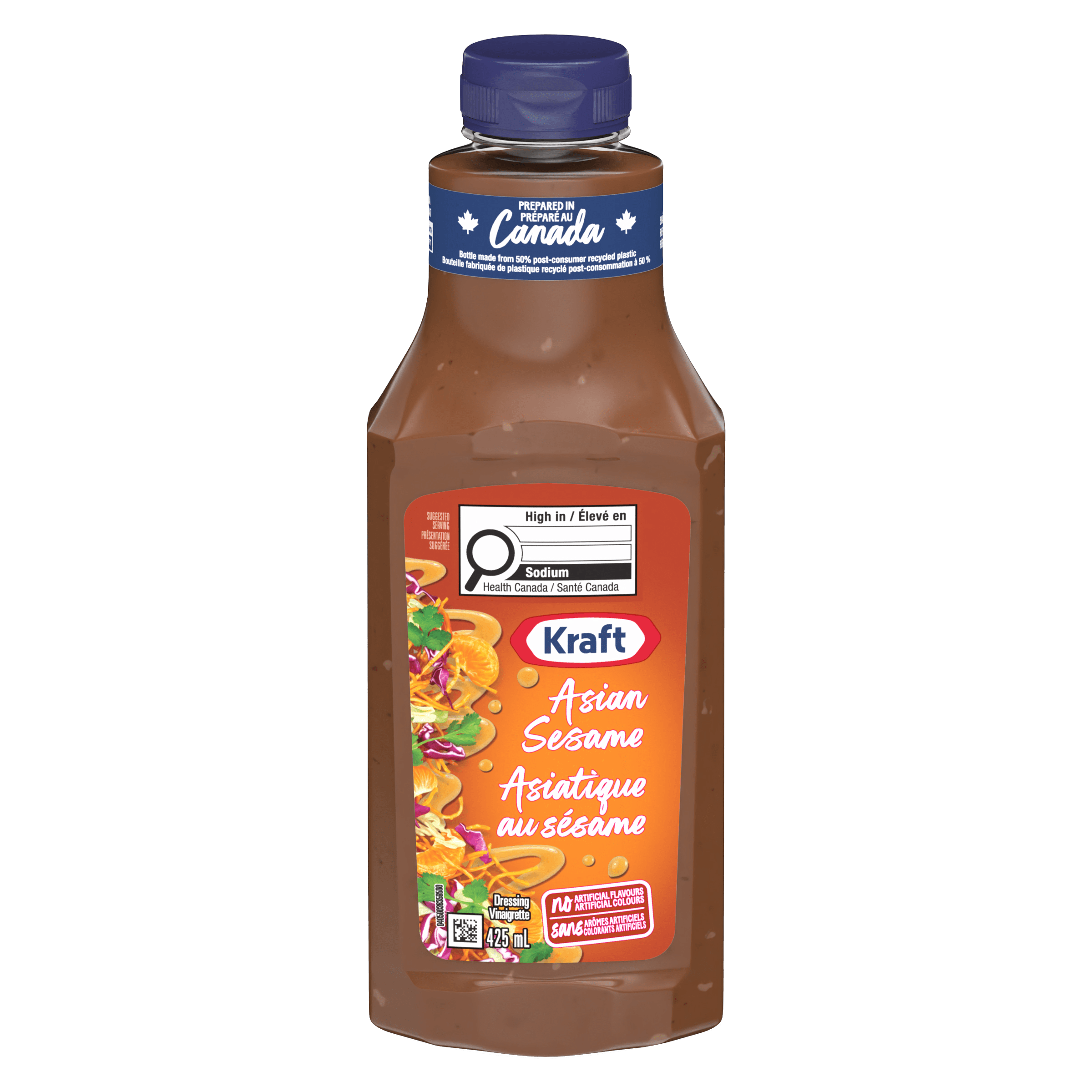 Créez des salades et des bols irrésistibles avec la vinaigrette Asiatique au sésame Kraft. Notre délicieuse vinaigrette apporte une riche saveur qui transforme les salades, les sandwichs, les wraps, les bols, les nouilles et plus encore. Essayez notre vinaigrette comme marinade, trempette ou ingrédient dans vos recettes préférées. La vinaigrette Asiatique au sésame Kraft est faite avec de la sauce soja, du vinaigre et des épices. Fièrement préparée au Canada, notre vinaigrette est faite sans arôme ni colorant artificiels. Chaque bouteille de 425 mL est fabriquée à partir de 50 % de plastique recyclé après consommation et est facile à tenir, à ranger et à verser sur toutes vos créations irrésistibles.