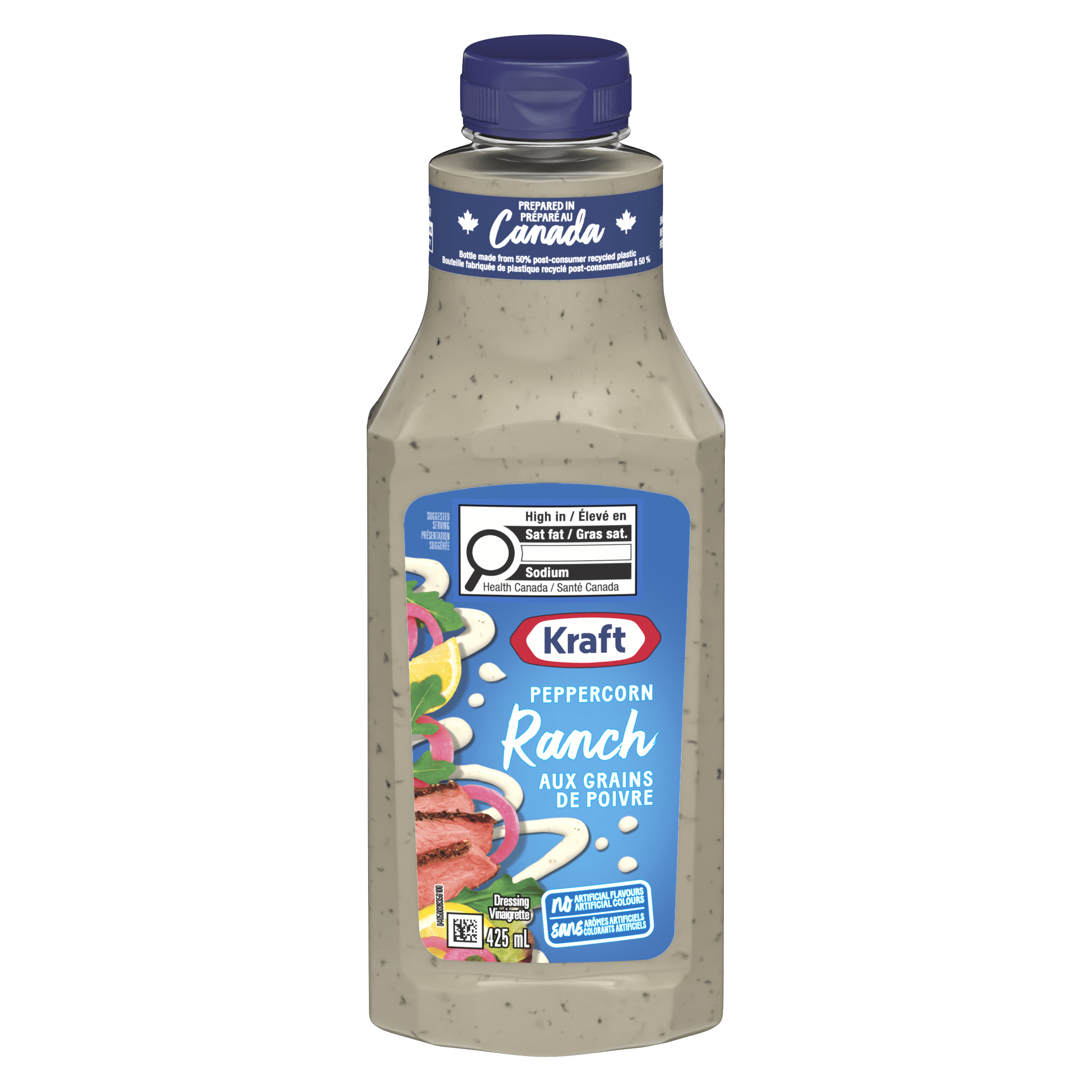 Créez des salades et des bols irrésistibles avec la vinaigrette Ranch aux grains de poivre Kraft. Notre délicieuse vinaigrette apporte une riche saveur qui transforme les salades, les sandwichs, les wraps, les bols, les pâtes et plus encore. Essayez notre vinaigrette comme marinade, trempette ou ingrédient dans vos recettes préférées. La vinaigrette Ranch aux grains de poivre Kraft est faire avec du fromage parmesan, du vinaigre, des œufs et des épices. Fièrement préparée au Canada, notre vinaigrette est faite sans arôme ni colorant artificiels. Chaque bouteille de 425 mL est fabriquée à partir de 50 % de plastique recyclé après consommation et est facile à tenir, à ranger et à verser sur toutes vos créations irrésistibles.
