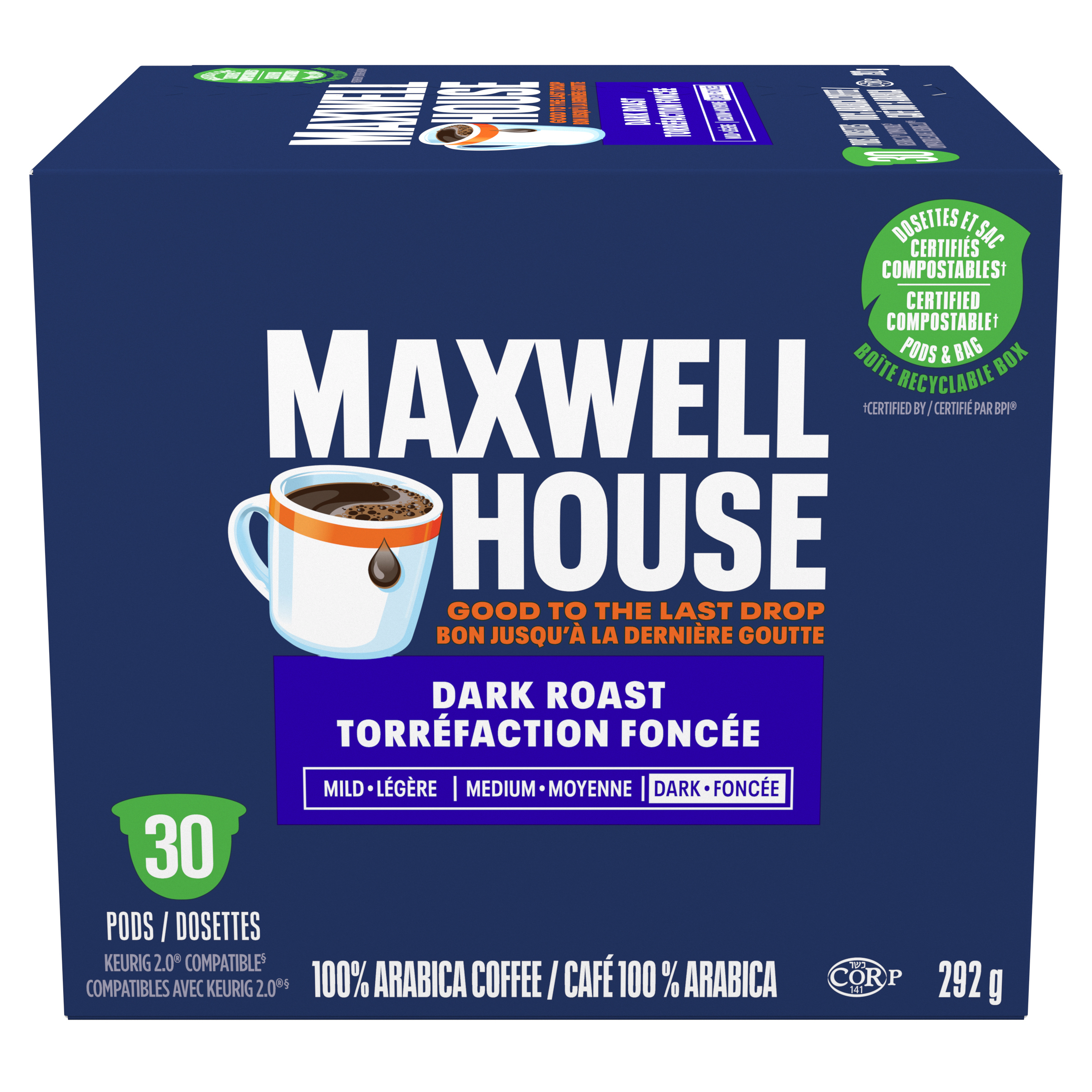 Prenez une pause avec le café qui a pratiquement inventé les pauses et soyez-en fiers pendant que vous le faites, car nos dosettes de café K-Cup® sont certifiées compostables. La journée a été mouvementée et elle est loin d'être terminée. Mais pas de soucis. Parce que vous avez tout compris. Vous allez préparer la torréfaction foncée conçue pour la détente et profiterez de l'arôme. Café Maxwell House Torréfaction Corsée Certifié Compostable K-Cup® Coffee Pods. Détendez-vous et savourez chaque gorgée de votre tasse chaude remplie d'arômes forts et corsés de Maxwell House. Ressourcez-vous avec ce goût toujours délicieux qui est bon jusqu'à la dernière goûte. Et quand cette tasse est vide et que vous êtes enfin énergisé... Vous pouvez plisser les yeux, rassembler votre équipement et retrousser vos manches, car maintenant, vous êtes prêt à tout affronter et il y a plein de dosettes de café K-Cup® prêtes à vous recharger dans votre boîte de 12 dosettes de café Maxwell House Torréfaction Corsée Coffee Certified Compostable K-Cup®. Montrez-leur de quoi vous êtes capables. Maxwell House. À votre max.