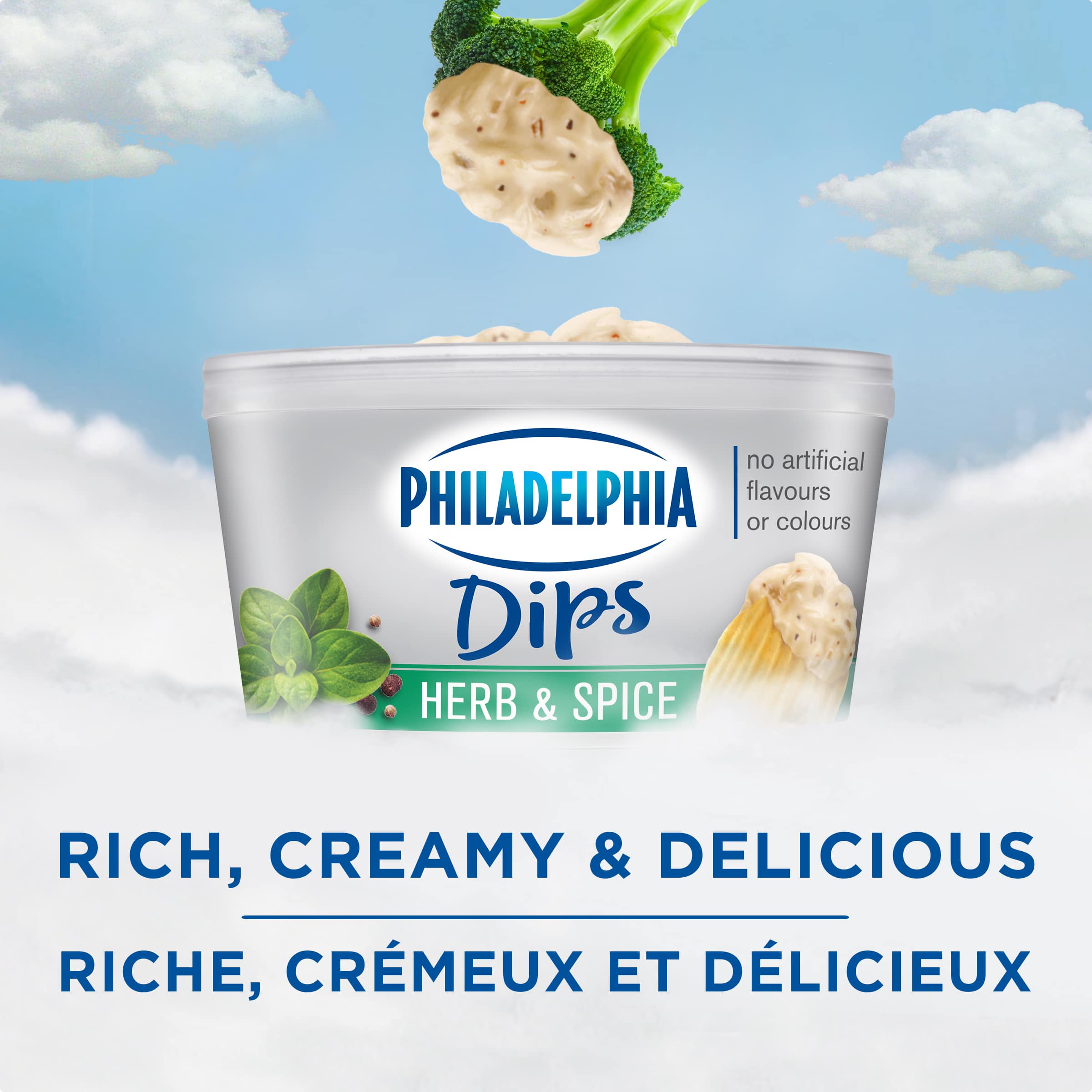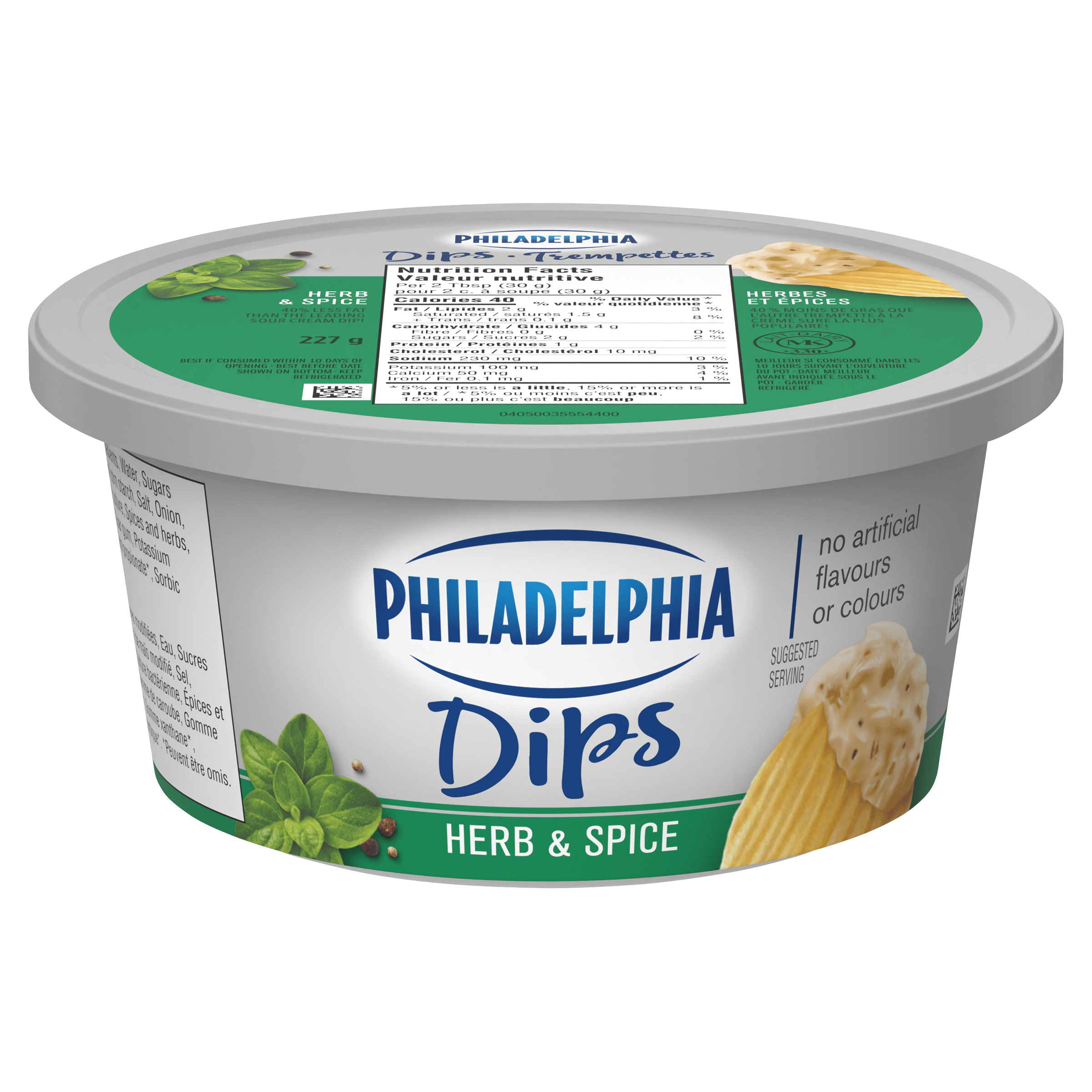 Retrouvez toute l’onctuosité du Philadelphia dans la trempette Philadelphia Herbes et épices! Que ce soit pour une petite collation ou une grande réception, les trempettes Philadelphia se marient à merveille avec vos croustilles, craquelins ou légumes préférés. Vous recevez? Sortez vos trempettes Philadelphia et voyez-les se volatiliser! Contenant 40 % moins de gras que la trempette à la crème sure la plus populaire, les trempettes Philadelphia sont les seules à être faites de fromage à la crème Philadelphia.