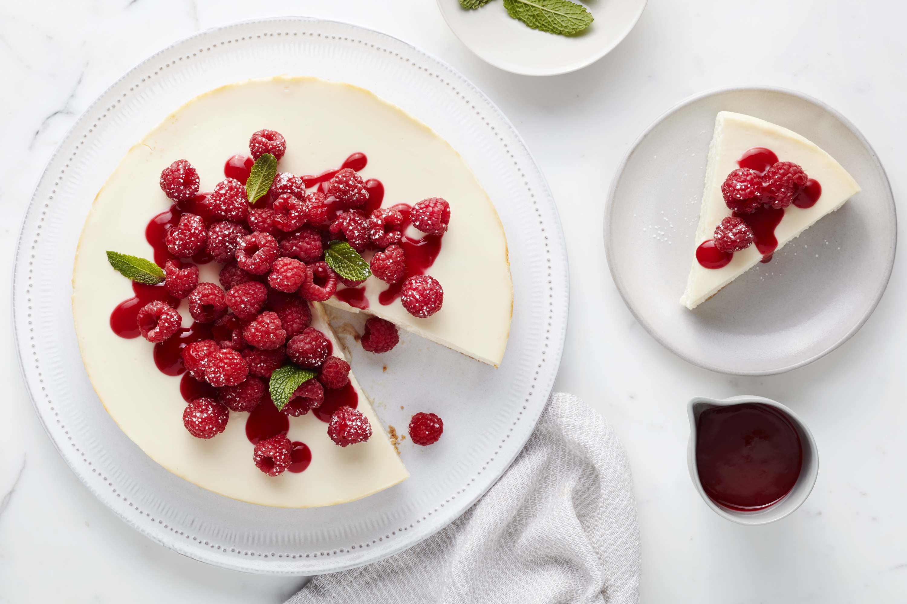 Servir le gâteau au fromage garni de la sauce aux framboises.