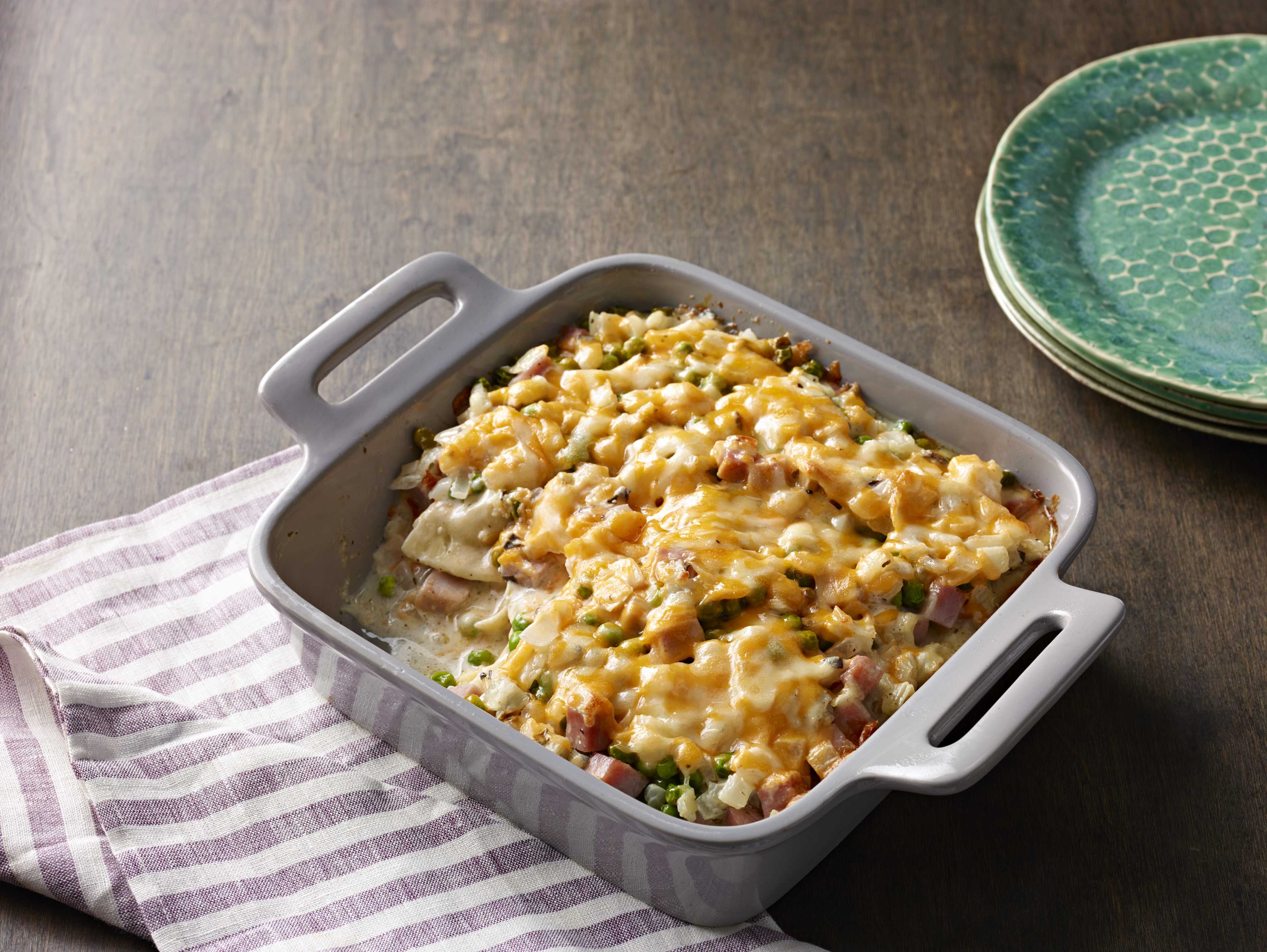 Mélanger les perogies, le jambon et les petits pois dans une casserole de 2 l vaporisée d'un enduit à cuisson; remuer légèrement avec la sauce de fromage à la crème et garnir du fromage râpé.