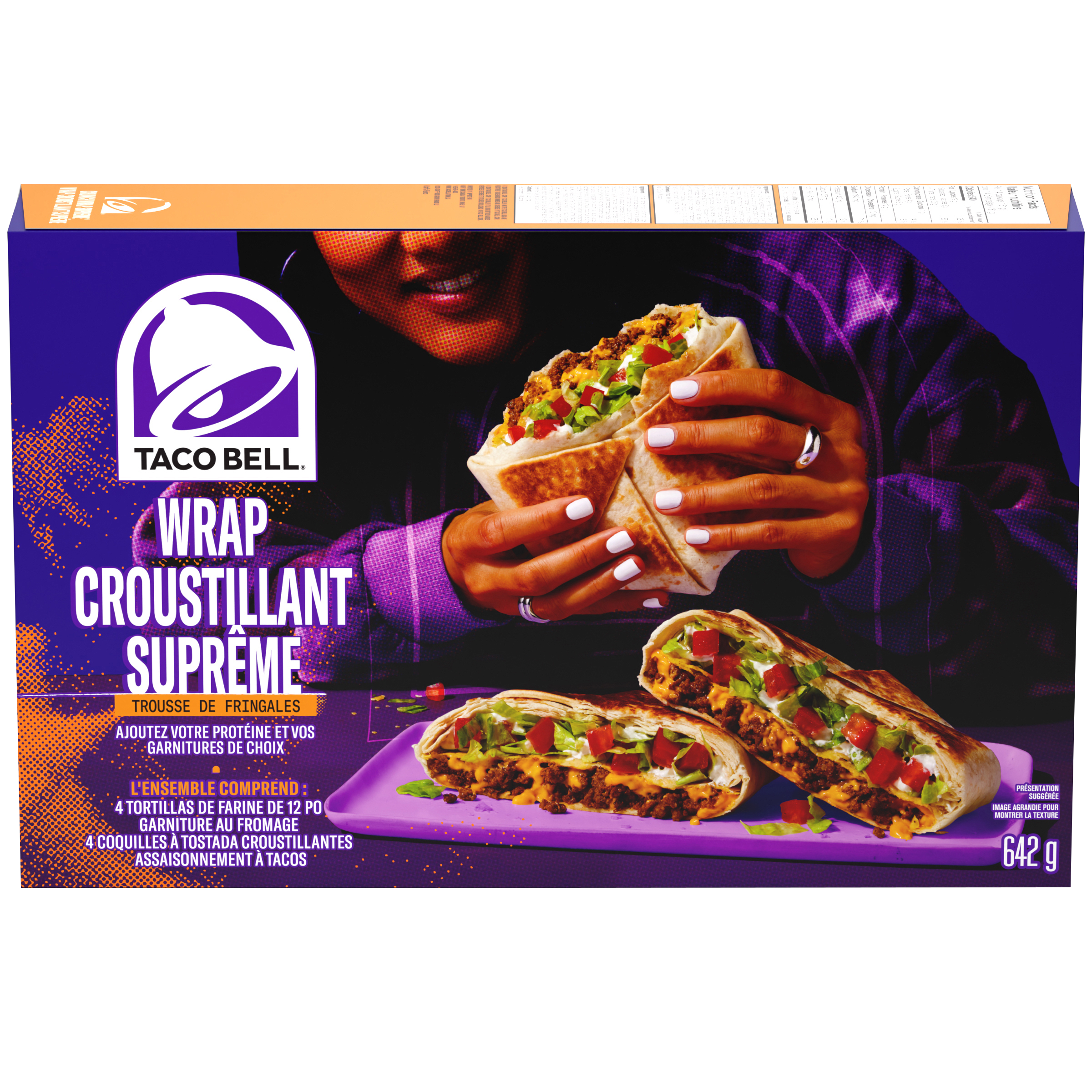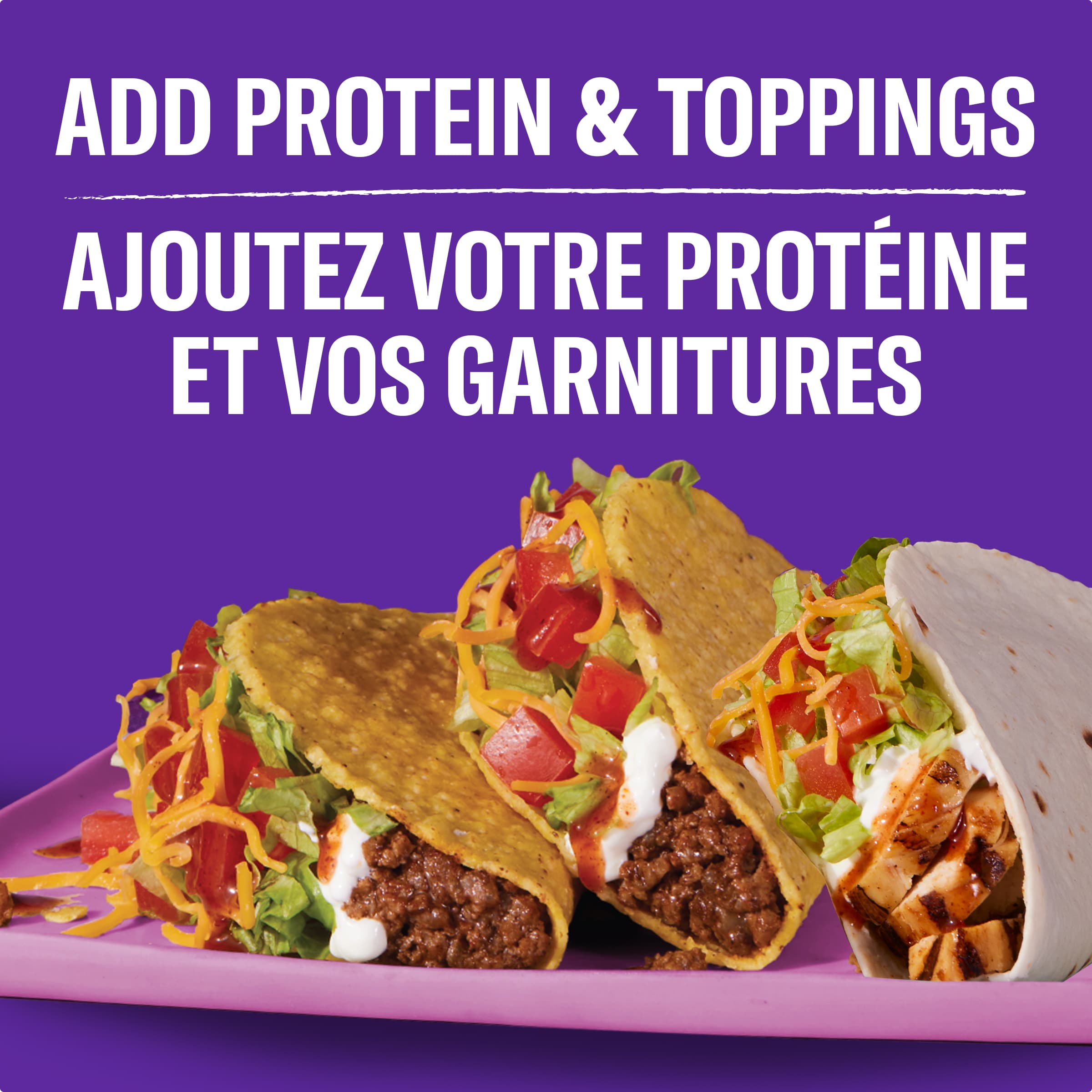 Ramenez la cloche à la maison avec notre Ensemble à tacos fringales Taco Croustillant et Souple Taco Bell. Taco Bell rend l'heure des repas plus fringante avec notre kit Cravings qui contient 6 tortillas molles, 6 coquilles de tacos croquantes, de la Sauce Taco Bell Douce et assaisonnement de tacos. Ajoutez vos protéines et garnitures pour un repas facile à préparer que toute votre famille appréciera. Servez vos tacos Taco Bell avec toutes les garnitures préférées de votre famille comme la salsa, la crème sure, le fromage, la laitue, les tomates et plus encore. Chaque boîte fait 6 portions de 2 tacos chacune Il y en a pour tous les goûts pour ramener l’envie à la maison