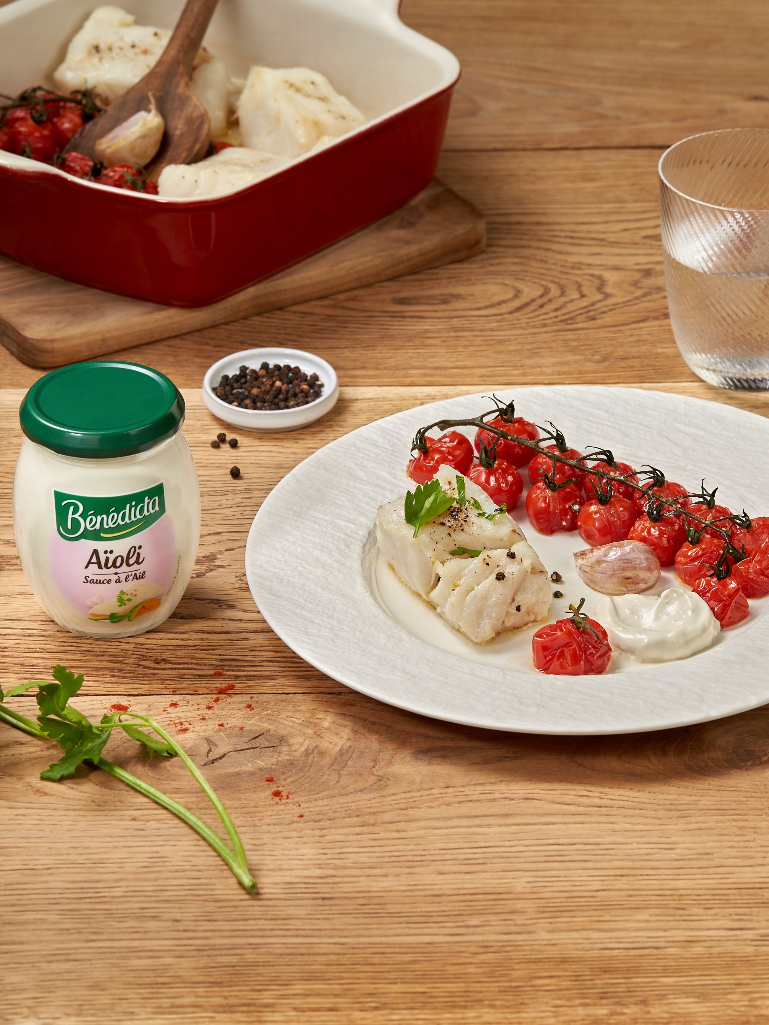 Dressez vos tomates cerises dans les assiettes et déposez le dos de cabillaud à côté. Ajoutez quelques brins de persil sur le poisson. Ajoutez une cuillère généreuse de la savoureuse sauce Aïoli Bénédicta sur le bord de votre assiette. Servez et dégustez