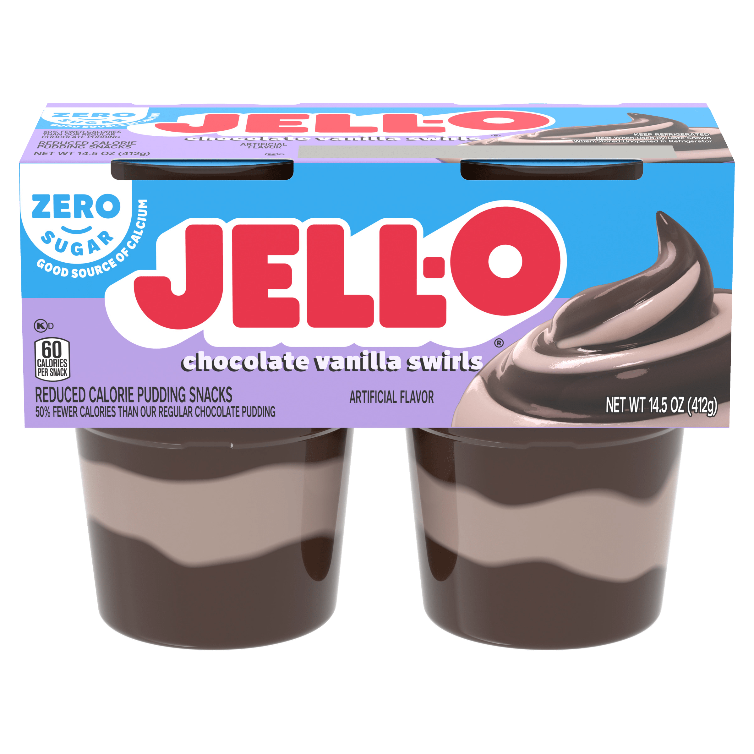 Jell-O Zero Sugar Chocolate Vanilla Swirls Artificially Flavored Pudding Cups deliver the great taste of Jell-O Pudding in a reduced-calorie choice....