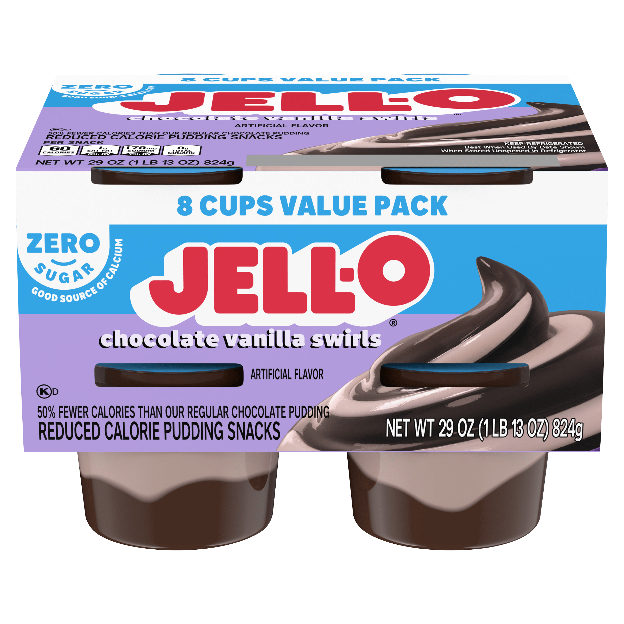 Jell-O Zero Sugar Chocolate Vanilla Swirls Artificially Flavored Pudding Cups deliver the great taste of Jell-O Pudding in a reduced-calorie choice. Our delicious on-the-go pudding comes in individual snack cups, perfect for putting into a lunchbox or snacking at home. Our creamy artificially flavored chocolate vanilla swirls pudding snacks contain zero sugar and 60 calories per serving, which is 50% fewer calories than regular Jell-O chocolate pudding. Each 14.5-ounce sleeve contains four Jell-O Zero Sugar Ready-to-Eat Chocolate Vanilla Swirls Artificially Flavored Pudding Cups for quick and easy snacking.