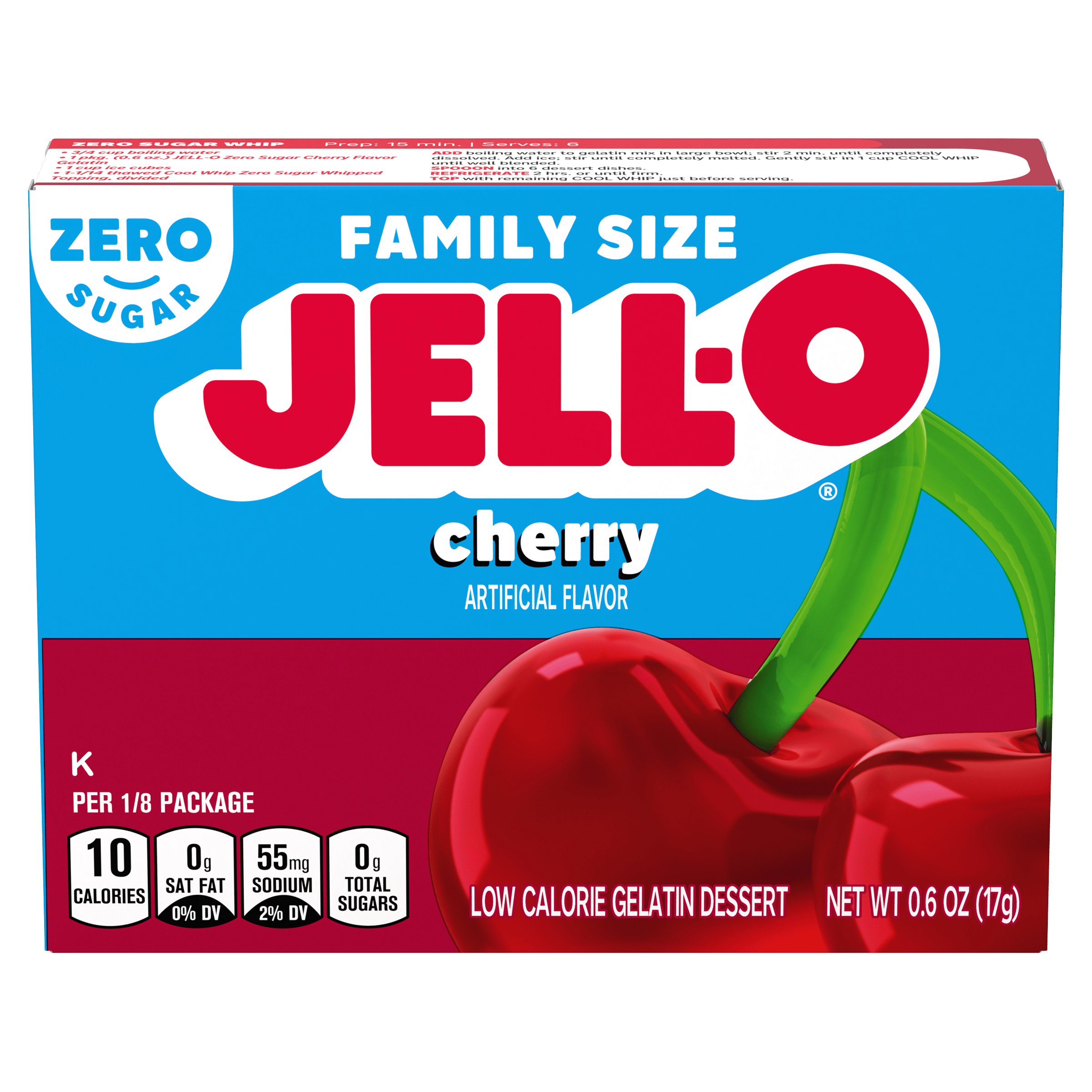 Snack happy. Jell-O Cherry Artificially Flavored Zero Sugar Low Calorie Gelatin Dessert Mix lets you add some wonder to your day with a fun snack....