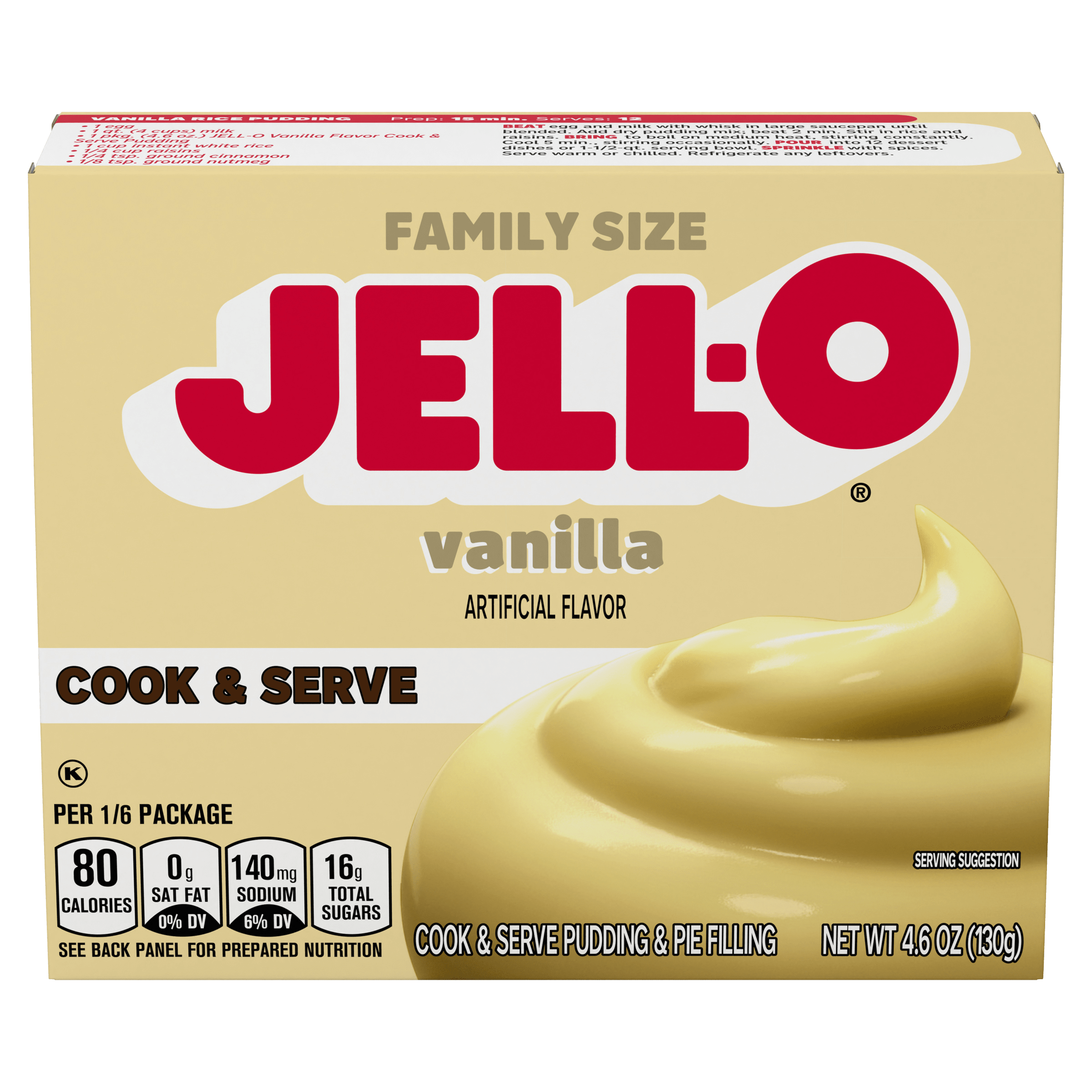 Snack happy. Jell-O Vanilla Artificially Flavored Cook & Serve Pudding & Pie Filling Mix tastes great whether you enjoy it as a treat or use it as an ingredient in your favorite dessert recipes. Add some wonder to your day with a delicious snack. Fun to make with your kids, our artificially flavored vanilla pudding mix can also be used to create a poke cake, tasty crepes or vanilla pie filling. To prepare, stir mix into 2 cups cold milk in medium saucepan, bring to a boil on medium heat while stirring constantly, then serve warm or chilled. Every Jell-O pudding mix comes packaged in a 3-ounce sealed pouch. Pudding fun in every bite.