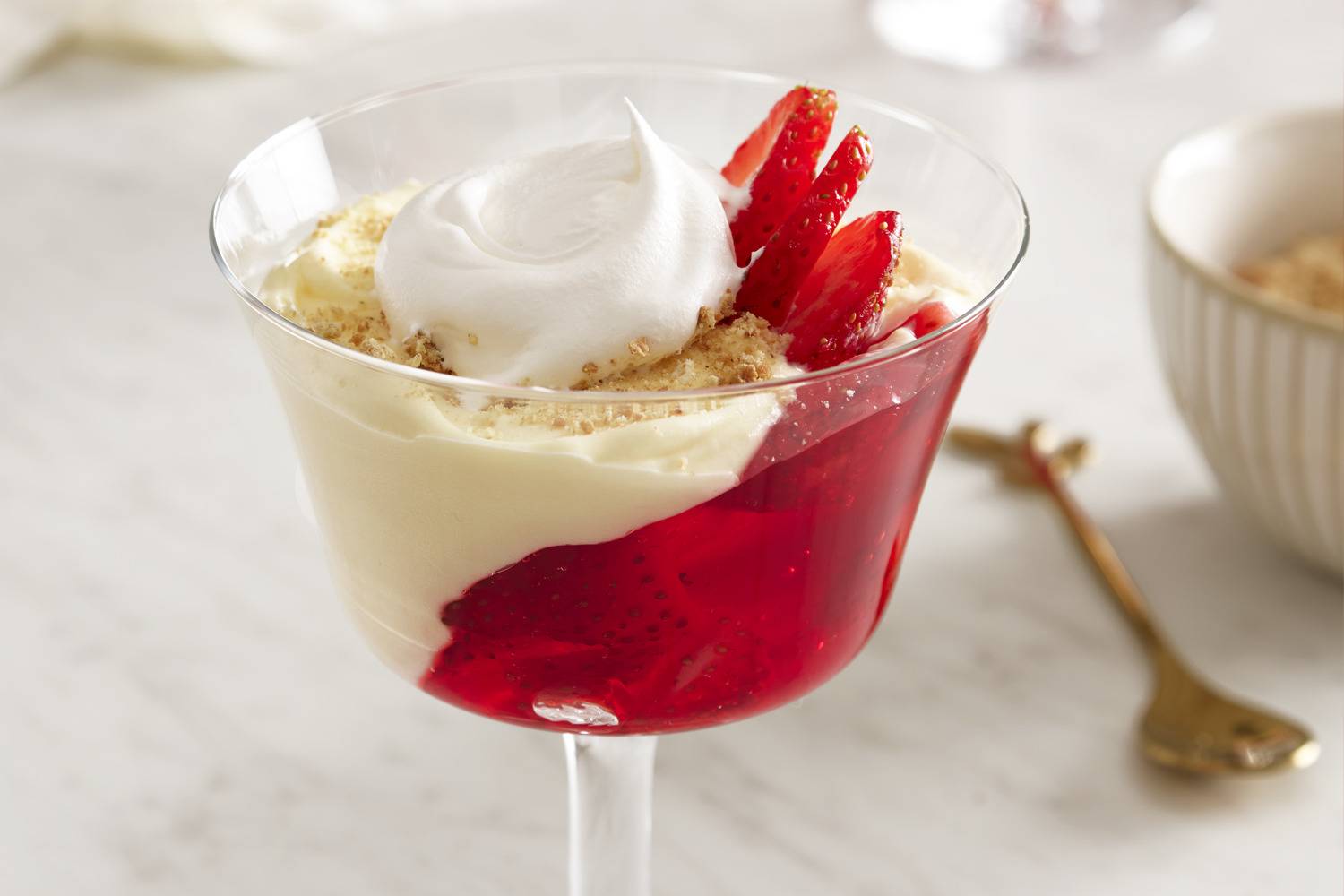Lean 6 parfait glasses, at an angle, against sides of muffin pan cups. Stir 3/4 cup strawberries into gelatin; spoon into parfait glasses, adding about 3/4 cup gelatin to each glass.