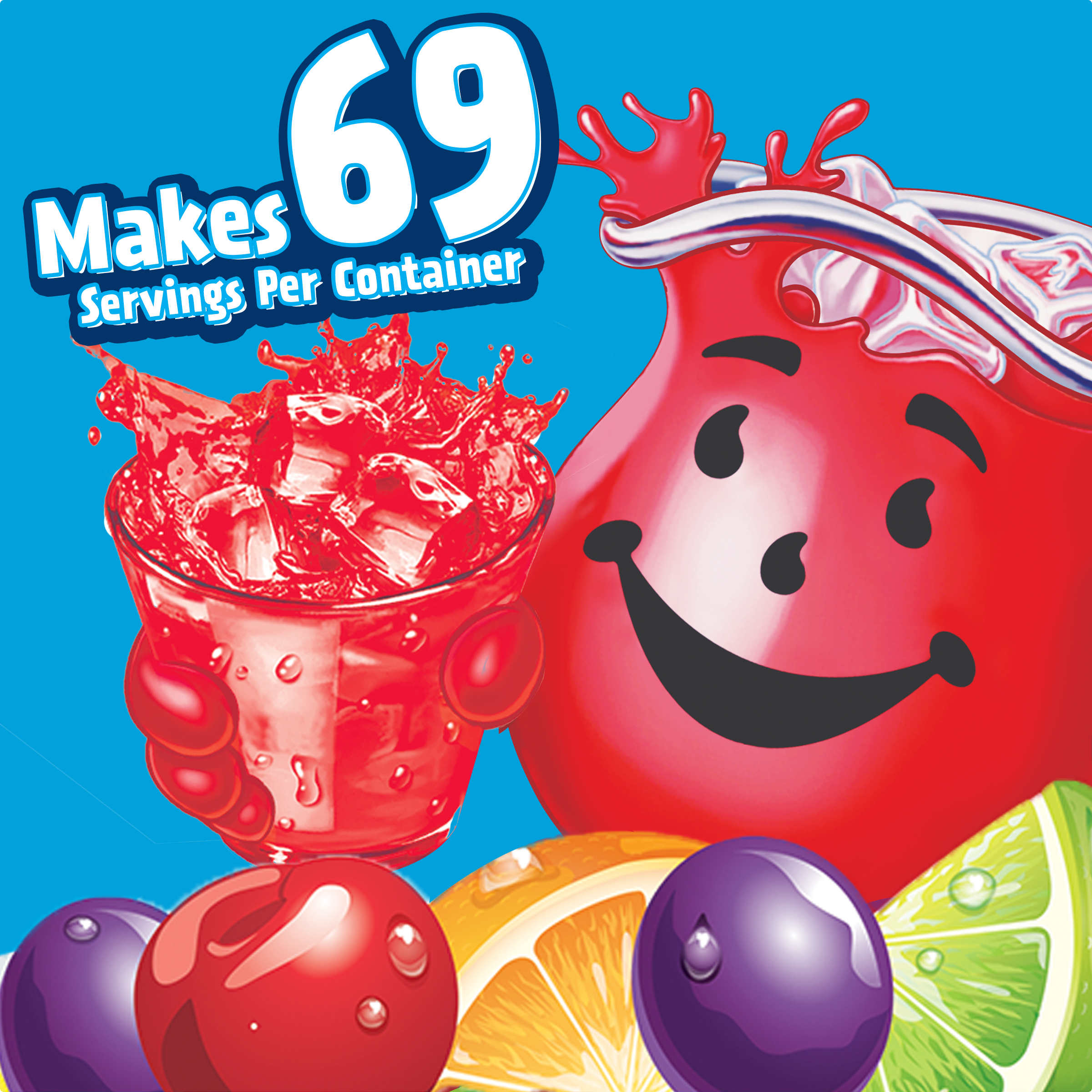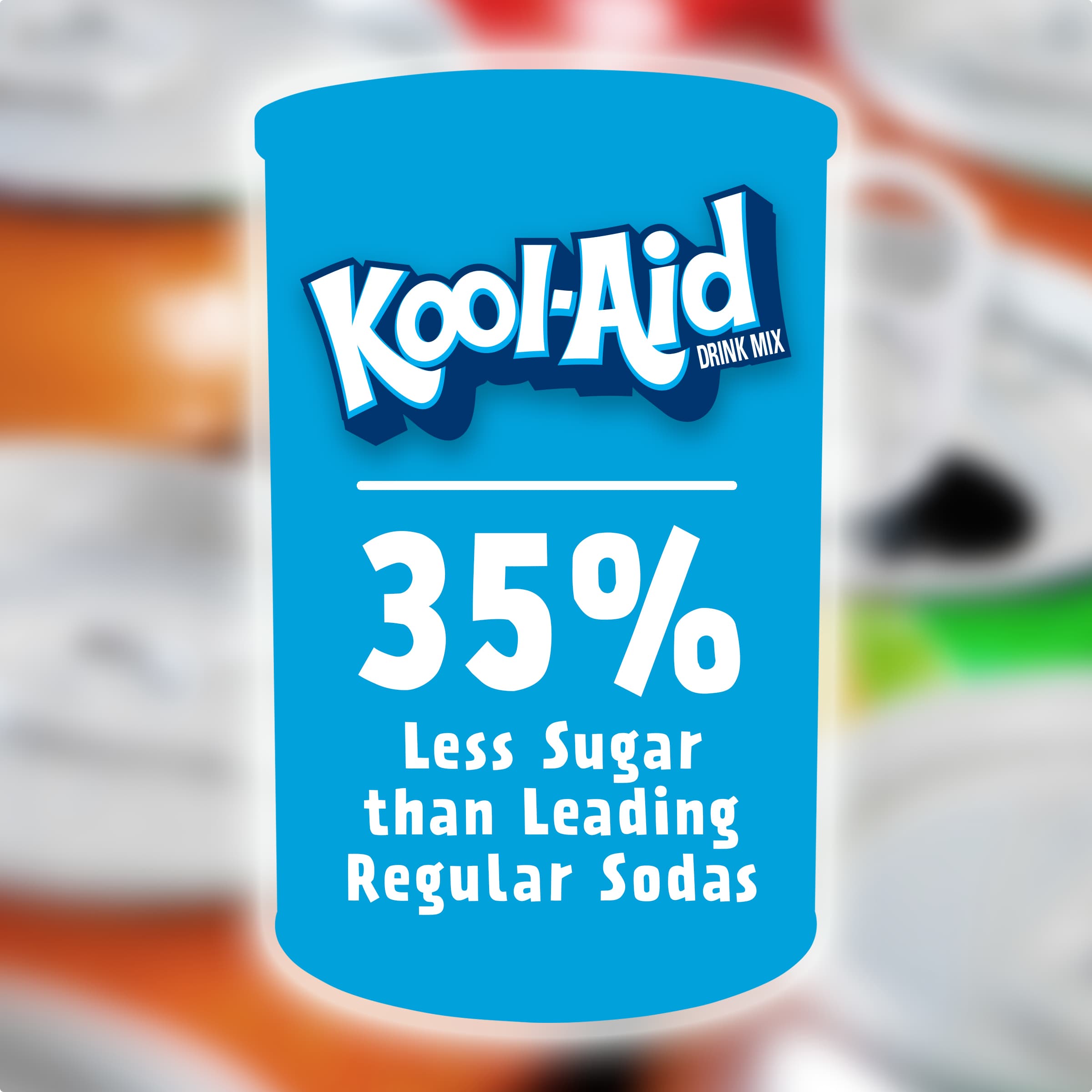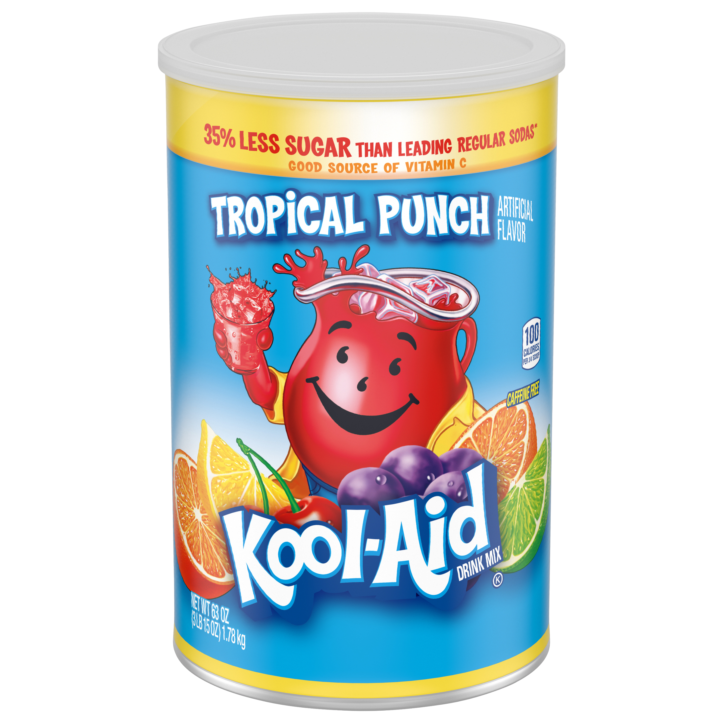 Brighten your day with a refreshing glass of Kool-Aid Artificially Flavored Tropical Punch Powdered Drink Mix. With a great taste that kids love, it's the perfect way to add fun to their day! Our Tropical Punch Drink Mix has 35% less sugar than leading regular sodas, (This product 25 grams total sugar; Leading regular sodas 40 grams total sugar per 12 fluid ounce serving), so it's something you can feel good about serving the whole family. Tropical Punch Kool-Aid comes in a resealable canister to keep the product fresh and has an easy-measure scoop for simple preparation. Each canister makes 26 quarts of product, so there is enough for the whole party to enjoy. Simply stir with water and ice to enjoy a refreshing glass of Tropical Punch Kool-Aid.