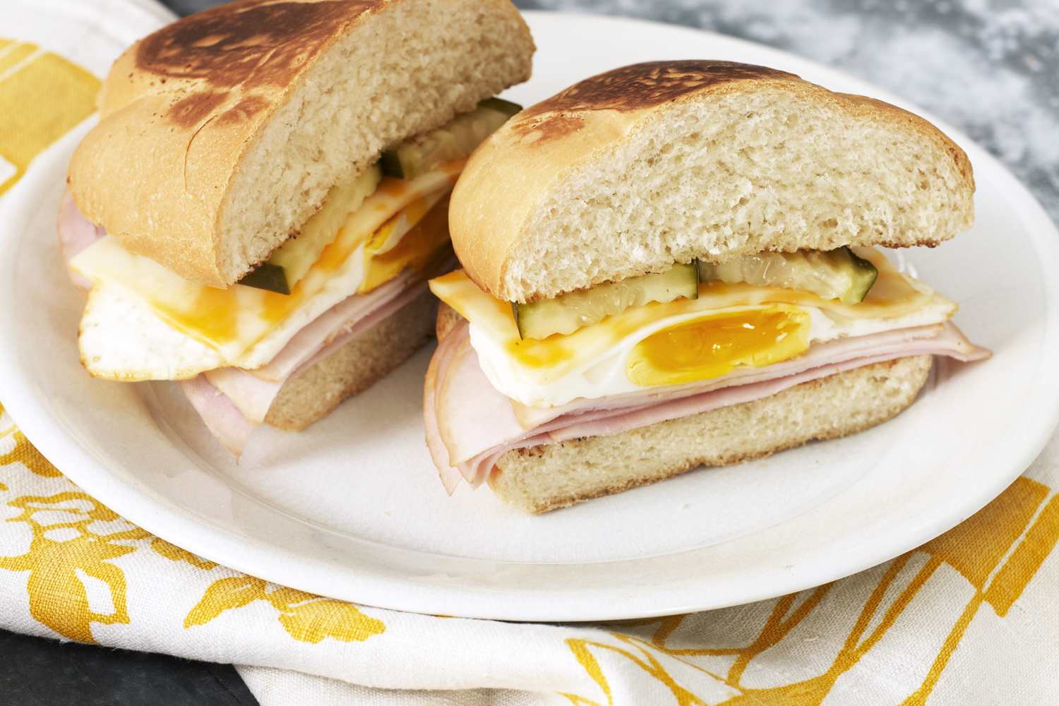 Perfectly cooked eggs are layered with cheese, ham, turkey and crunchy kosher dill pickle slices to make these hearty sandwiches.