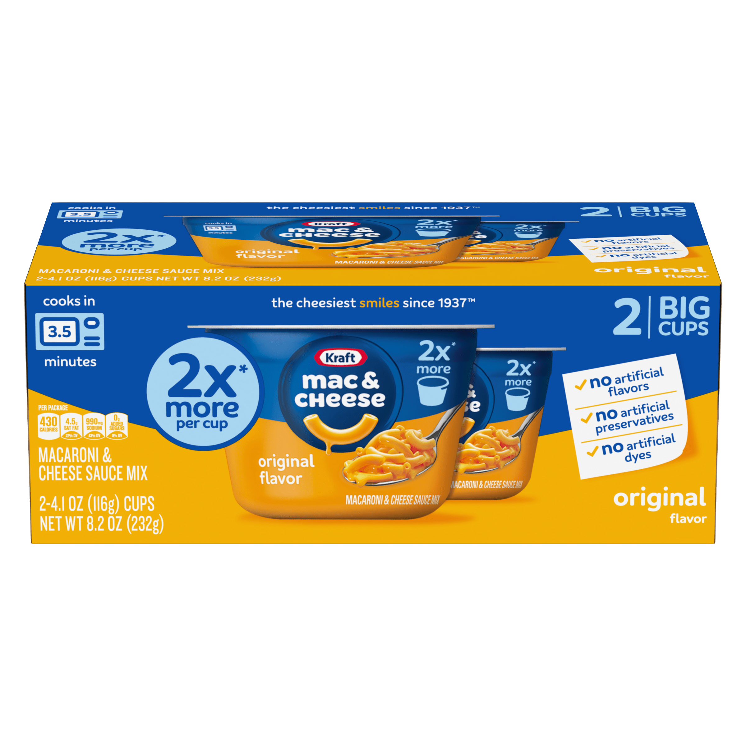 Help yourself to a cup of comfort. Kraft Original Mac and Cheese Big Cups are easy and ready in just minutes. Kids and adults love the rich taste and...