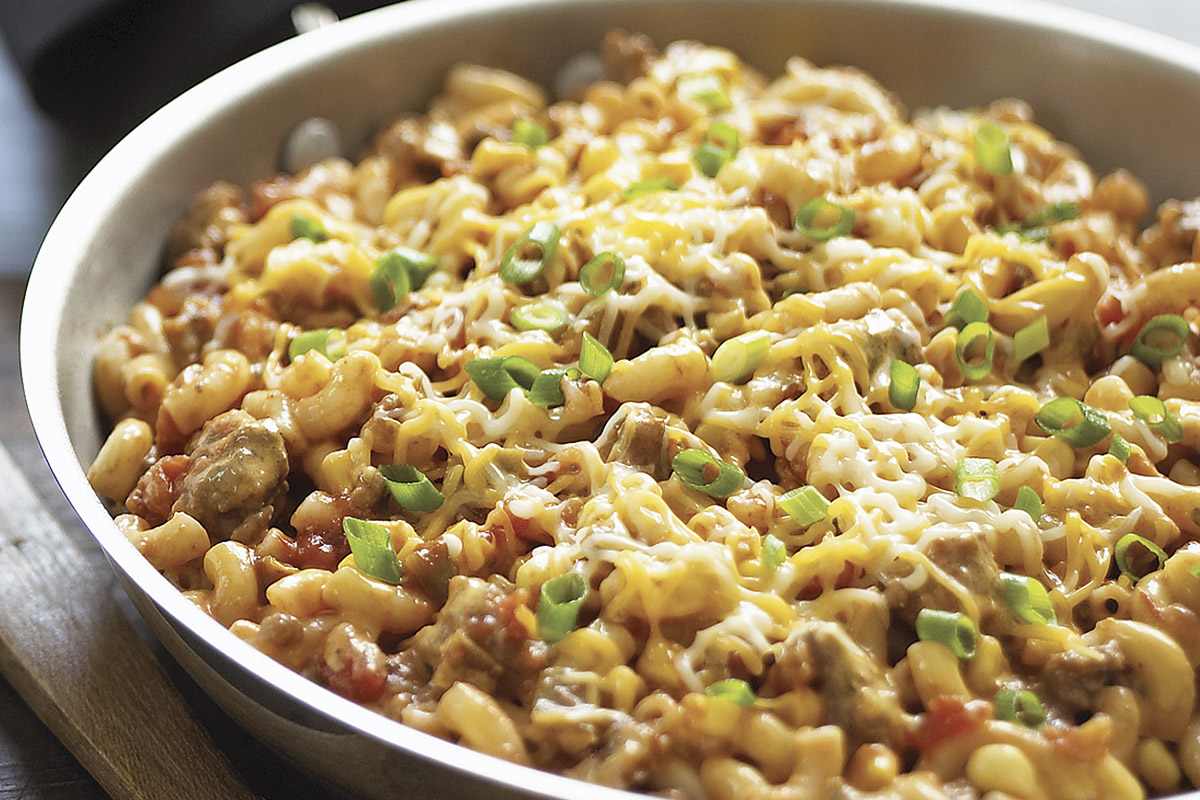 It's hard to believe we got all this goodness into a one-pot skillet dish—but true! It has ground beef, mac and cheese, salsa—and more cheese.