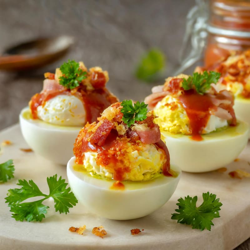 You've NEVER tasted deviled eggs this delicious. Sugary bacon, sriracha and even pickle juice combine in the most delicious appetizer on the platter.