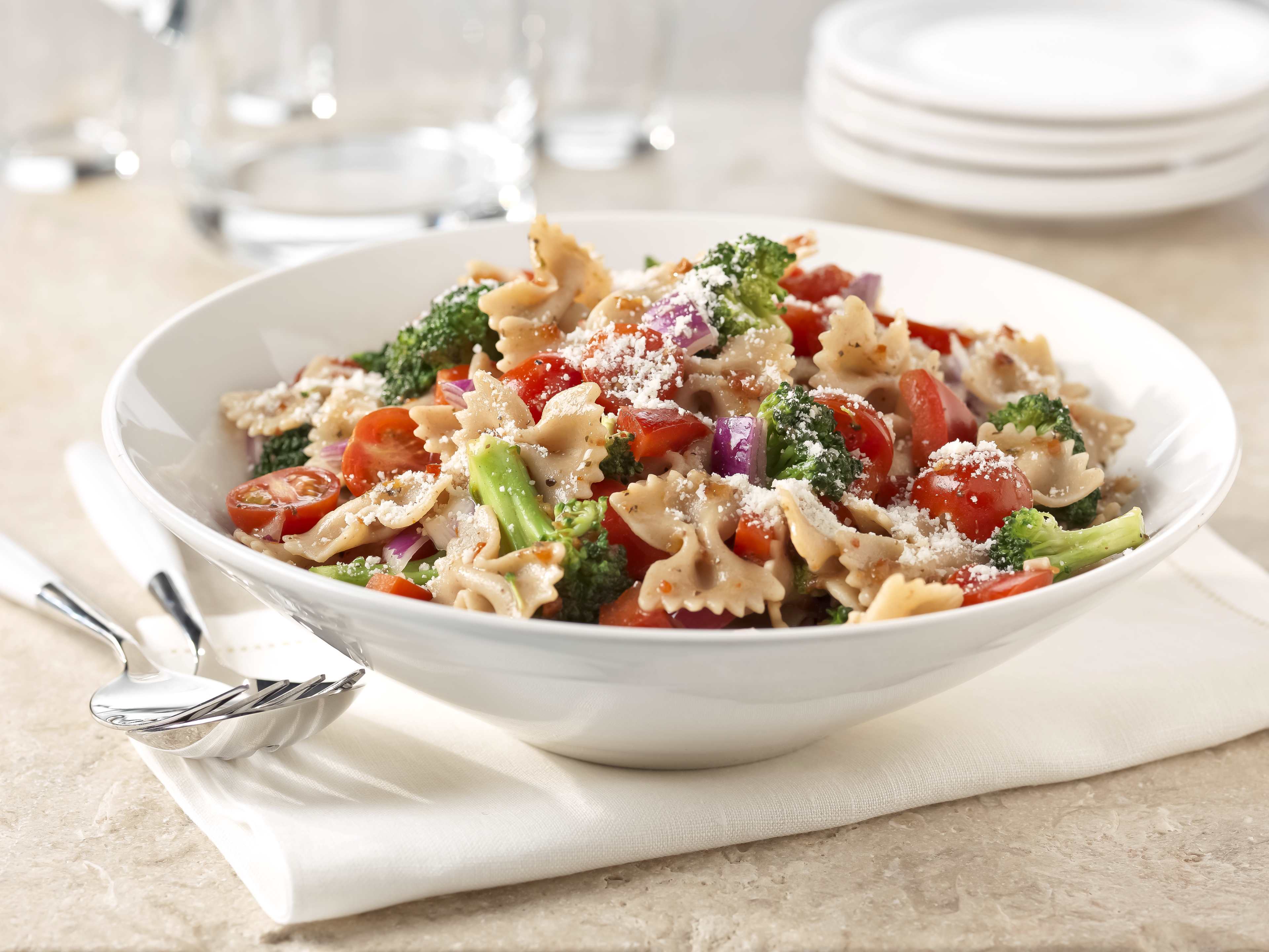 Ripe vegetables and whole wheat noodles get together for a better-for-you take on pasta salad.