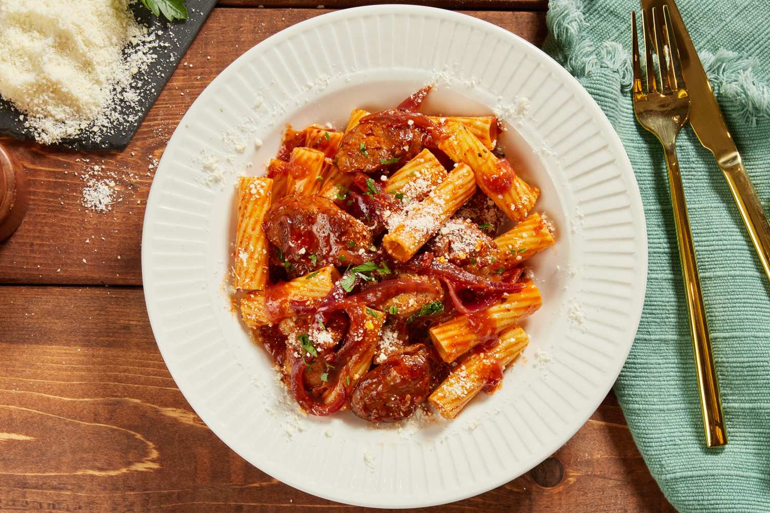 Serve up our classic rigatoni recipe with just 10 minutes of prep time! Our Sausage and Tomato Rigatoni recipe features red onion and parsley flavors.
