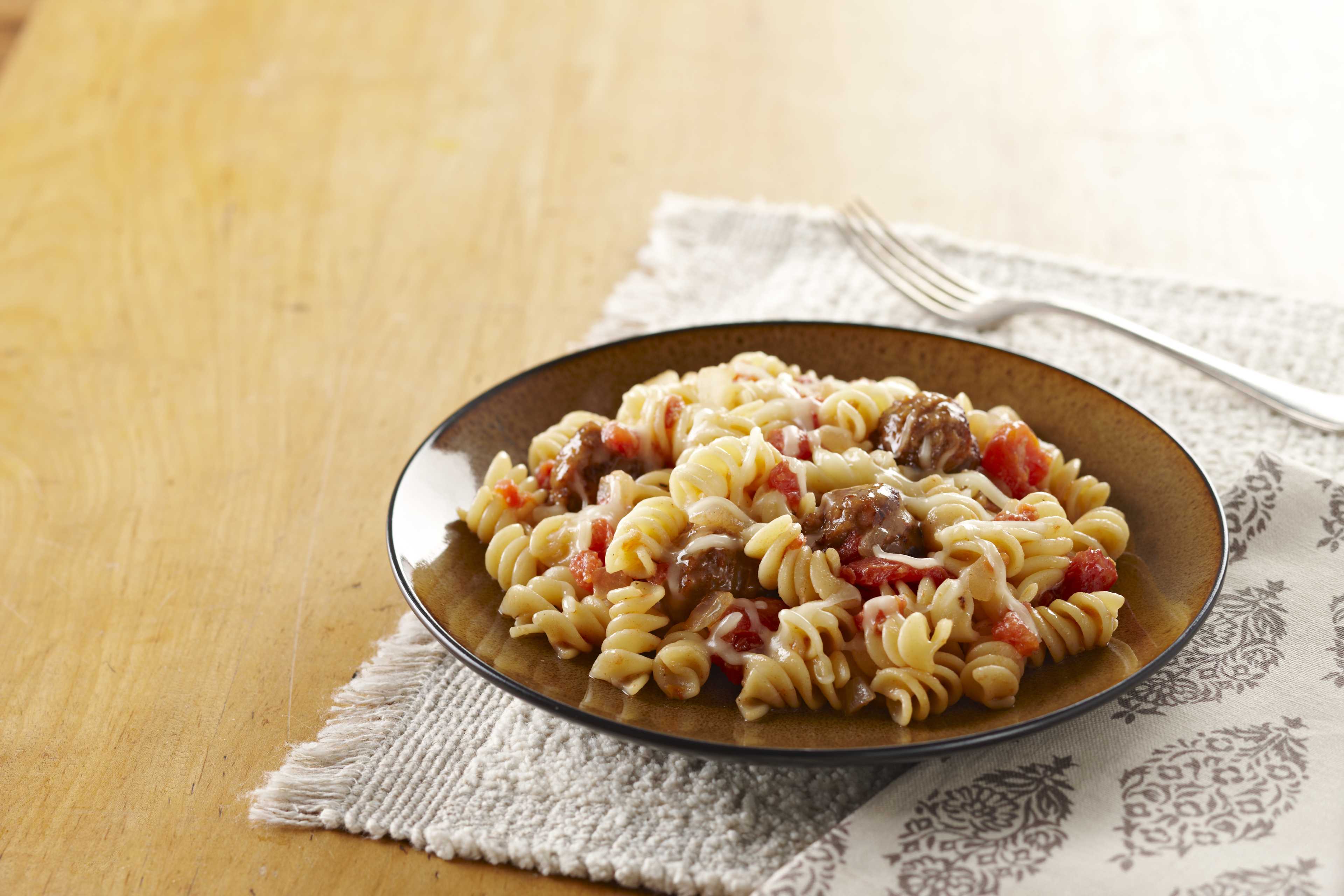 Toss diced tomatoes and sliced Italian sausage with cooked pasta for this Quick & Cheesy Sausage Rotini. This sausage rotini is an easy weeknight dish.