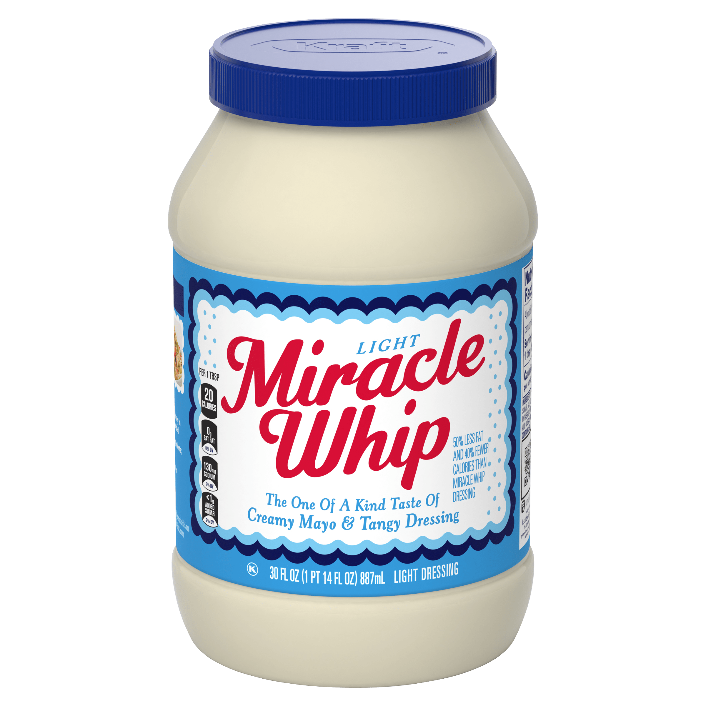 Miracle Whip Light Mayo-like Dressing adds a cool, zesty flavor to almost anything. Bursting with tangy vinegar and a medley of spices, our family favorite dressing and condiment delivers creamy texture and delicious flavor in every bite. As a spread similar-tasting to mayonnaise, light Miracle Whip is known for kicking sandwiches up a notch. Try out this versatile ingredient that can be used to make tangy salad dressings and even chocolate cakes for a finger-licking adventure. Our Light Miracle Whip contains fewer calories and fat than Kraft Mayonnaise. This product contains 20 calories and 1.5g fat per serving, Kraft Mayonnaise contains 90 calories and 10g fat per serving. Try light Miracle Whip for sandwiches and salads, in your favorite chicken recipe or as a creamy burger sauce. It also makes a tasty secret ingredient in deviled eggs and potato salad. Each jar should be stored in the refrigerator after opening.
