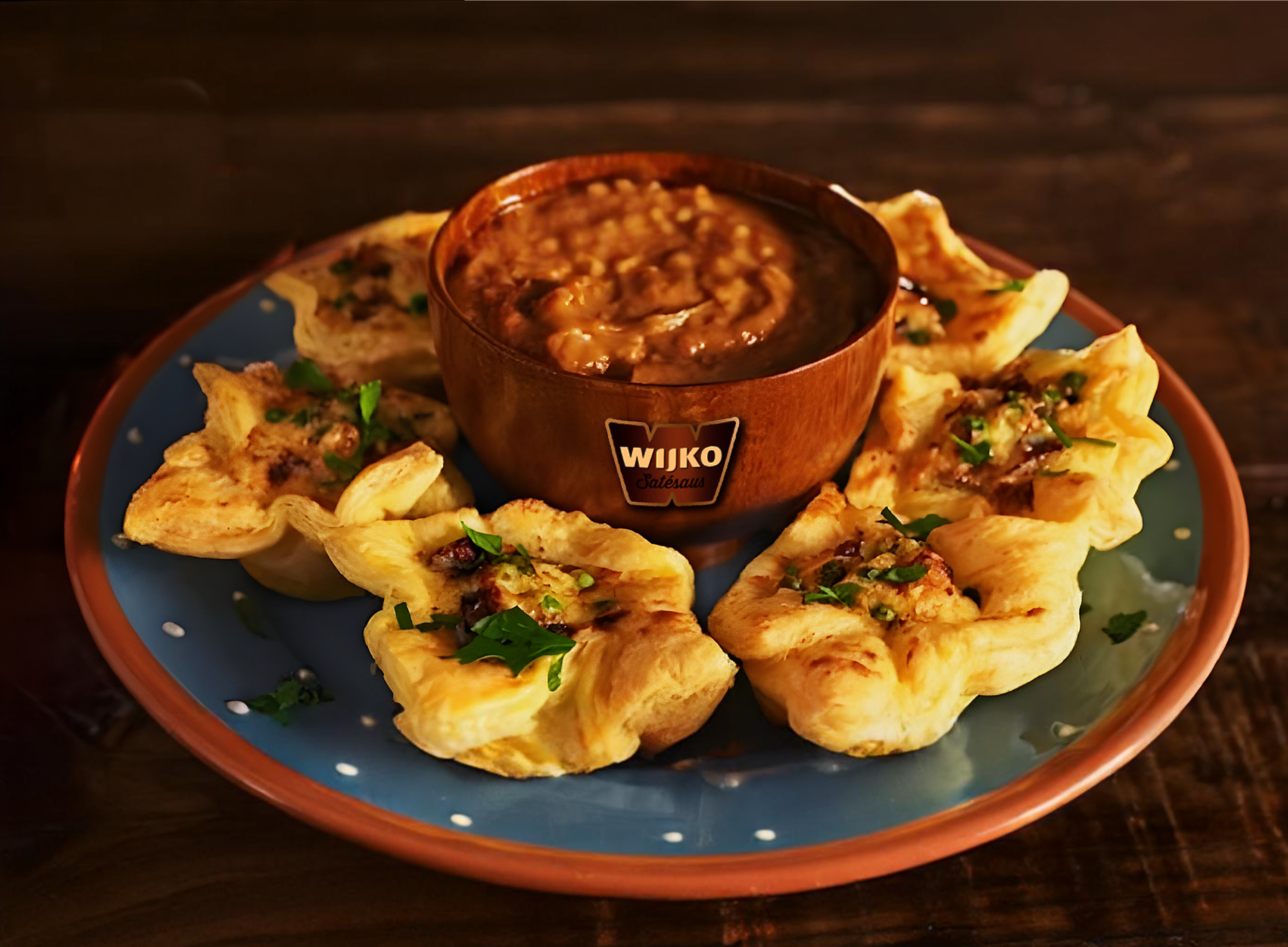 Serveer direct de wraps en zet er een bakje overgebleven satésaus bij voor de liefhebber.