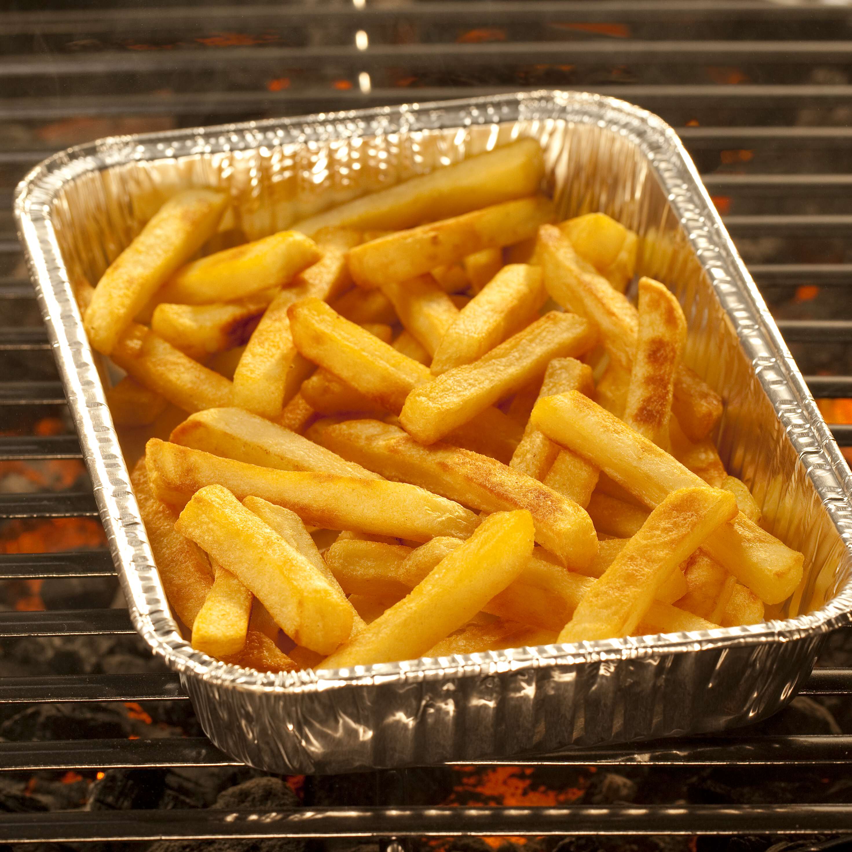 Place fries in disposable foil pan sprayed with cooking spray. Place pan on grill grate.