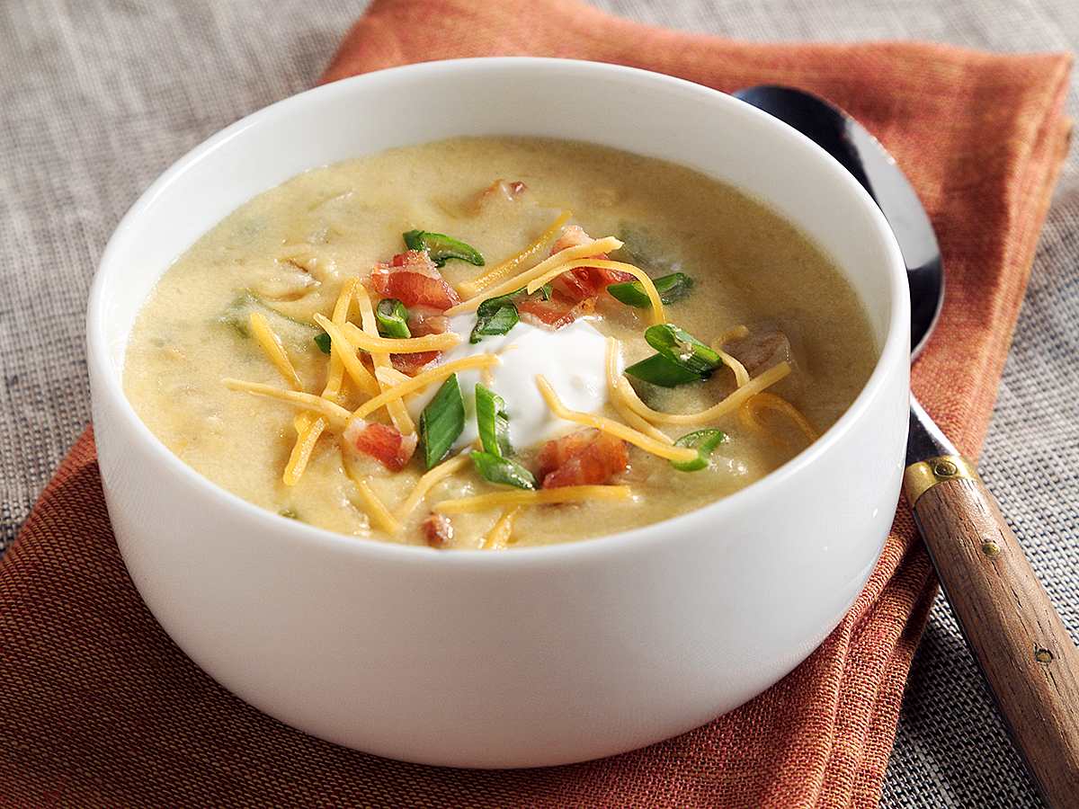 Serve topped with reserved green onions, bacon, cheese and sour cream.